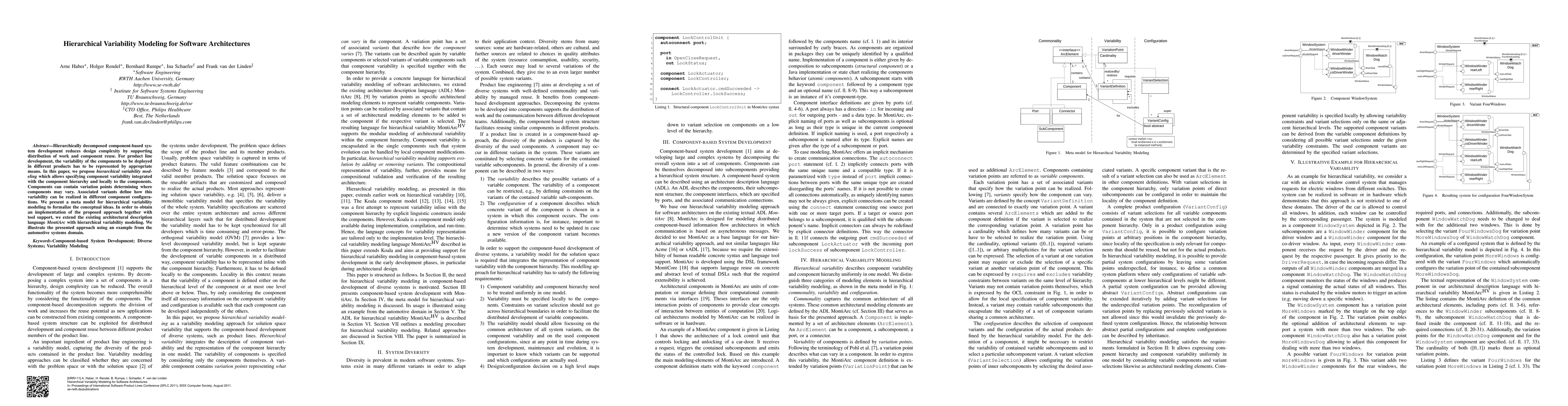 This paper proposes hierarchical variability modeling to manage component variability in software architectures, integrating it with component hierarchies and local components. The authors extend MontiArc with this approach and demonstrate its application in automotive systems.