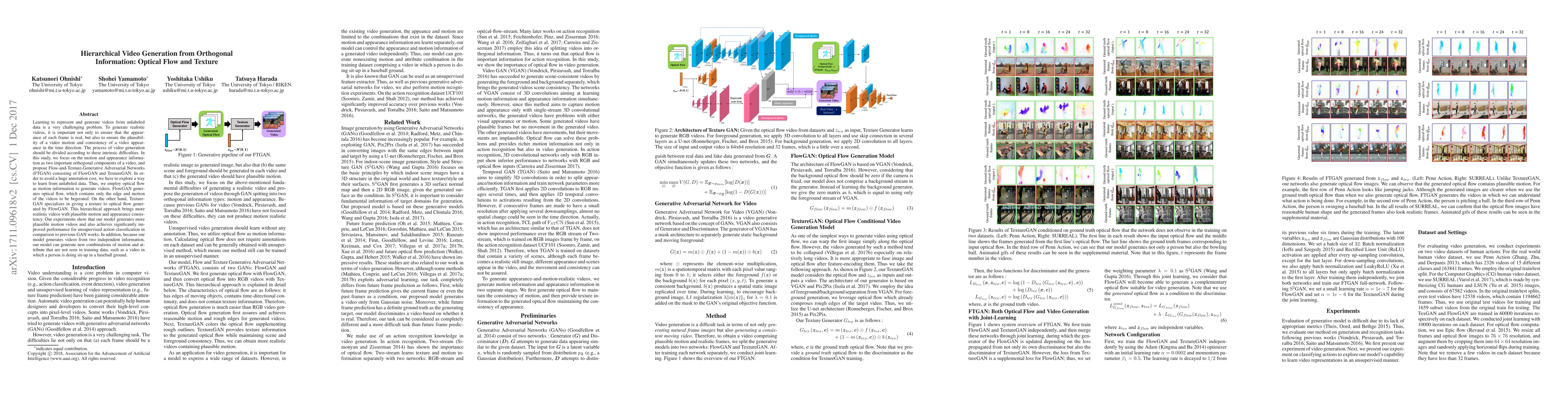 Learning to represent and generate videos from unlabeled data is a very challenging problem. To generate realistic videos, it is important not only to ensure that the appearance of each frame is real, but also to ensure the plausibility of a video motion and consistency of a video appearance in the time direction. The process of video generation should be divided according to these intrinsic difficulties. In this study, we focus on the motion and appearance information as two important orthogonal components of a video, and propose Flow-and-Texture-Generative Adversarial Networks (FTGAN) consisting of FlowGAN and TextureGAN. In order to avoid a huge annotation cost, we have to explore a way to learn from unlabeled data. Thus, we employ optical flow as motion information to generate videos. FlowGAN generates optical flow, which contains only the edge and motion of the videos to be begerated. On the other hand, TextureGAN specializes in giving a texture to optical flow generated by FlowGAN. This hierarchical approach brings more realistic videos with plausible motion and appearance consistency. Our experiments show that our model generates more plausible motion videos and also achieves significantly improved performance for unsupervised action classification in comparison to previous GAN works. In addition, because our model generates videos from two independent information, our model can generate new combinations of motion and attribute that are not seen in training data, such as a video in which a person is doing sit-up in a baseball ground.