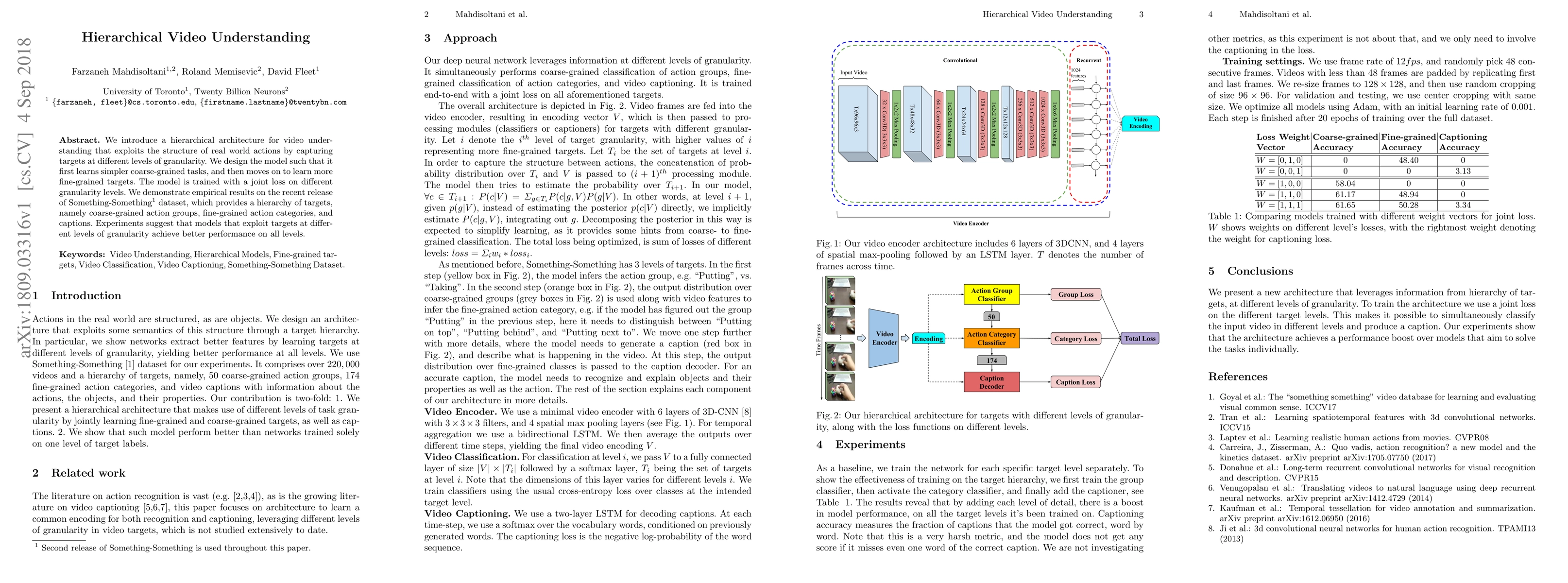 We introduce a hierarchical architecture for video understanding that exploits the structure of real world actions by capturing targets at different levels of granularity. We design the model such that it first learns simpler coarse-grained tasks, and then moves on to learn more fine-grained targets. The model is trained with a joint loss on different granularity levels. We demonstrate empirical results on the recent release of Something-Something dataset, which provides a hierarchy of targets, namely coarse-grained action groups, fine-grained action categories, and captions. Experiments suggest that models that exploit targets at different levels of granularity achieve better performance on all levels.