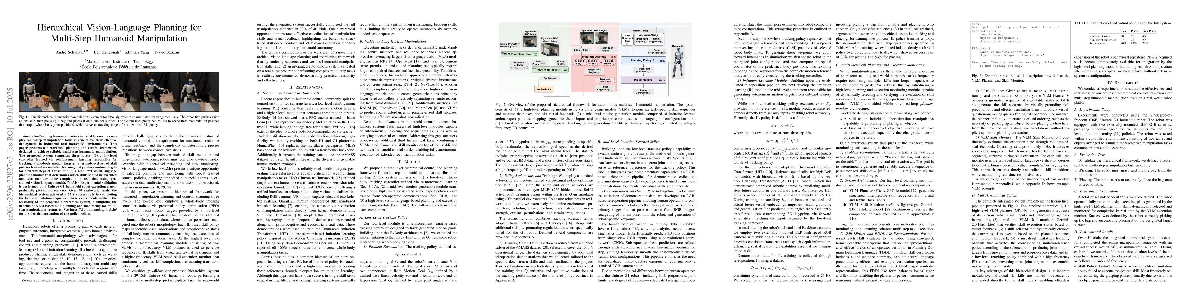Enabling humanoid robots to reliably execute complex multi-step manipulation tasks is crucial for their effective deployment in industrial and household environments. This paper presents a hierarchical planning and control framework designed to achieve reliable multi-step humanoid manipulation. The proposed system comprises three layers: (1) a low-level RL-based controller responsible for tracking whole-body motion targets; (2) a mid-level set of skill policies trained via imitation learning that produce motion targets for different steps of a task; and (3) a high-level vision-language planning module that determines which skills should be executed and also monitors their completion in real-time using pretrained vision-language models (VLMs). Experimental validation is performed on a Unitree G1 humanoid robot executing a non-prehensile pick-and-place task. Over 40 real-world trials, the hierarchical system achieved a 72.5% success rate in completing the full manipulation sequence. These experiments confirm the feasibility of the proposed hierarchical system, highlighting the benefits of VLM-based skill planning and monitoring for multi-step manipulation scenarios. See https://vlp-humanoid.github.io/ for video demonstrations of the policy rollout.
