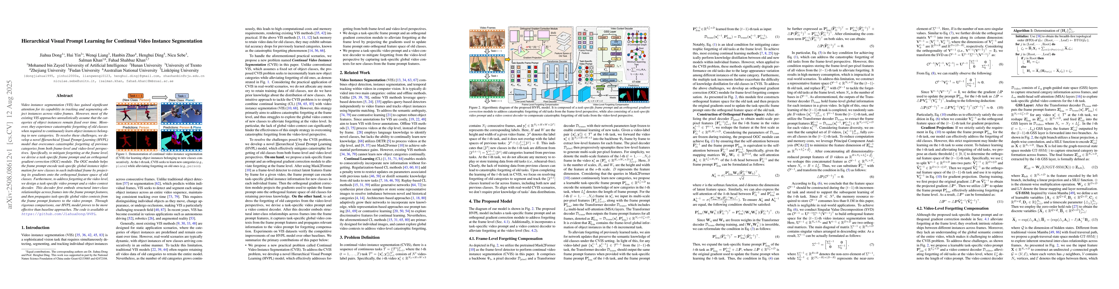 Video instance segmentation (VIS) has gained significant attention for its capability in tracking and segmenting object instances across video frames. However, most of the existing VIS approaches unrealistically assume that the categories of object instances remain fixed over time. Moreover, they experience catastrophic forgetting of old classes when required to continuously learn object instances belonging to new categories. To resolve these challenges, we develop a novel Hierarchical Visual Prompt Learning (HVPL) model that overcomes catastrophic forgetting of previous categories from both frame-level and video-level perspectives. Specifically, to mitigate forgetting at the frame level, we devise a task-specific frame prompt and an orthogonal gradient correction (OGC) module. The OGC module helps the frame prompt encode task-specific global instance information for new classes in each individual frame by projecting its gradients onto the orthogonal feature space of old classes. Furthermore, to address forgetting at the video level, we design a task-specific video prompt and a video context decoder. This decoder first embeds structural inter-class relationships across frames into the frame prompt features, and then propagates task-specific global video contexts from the frame prompt features to the video prompt. Through rigorous comparisons, our HVPL model proves to be more effective than baseline approaches. The code is available at https://github.com/JiahuaDong/HVPL.