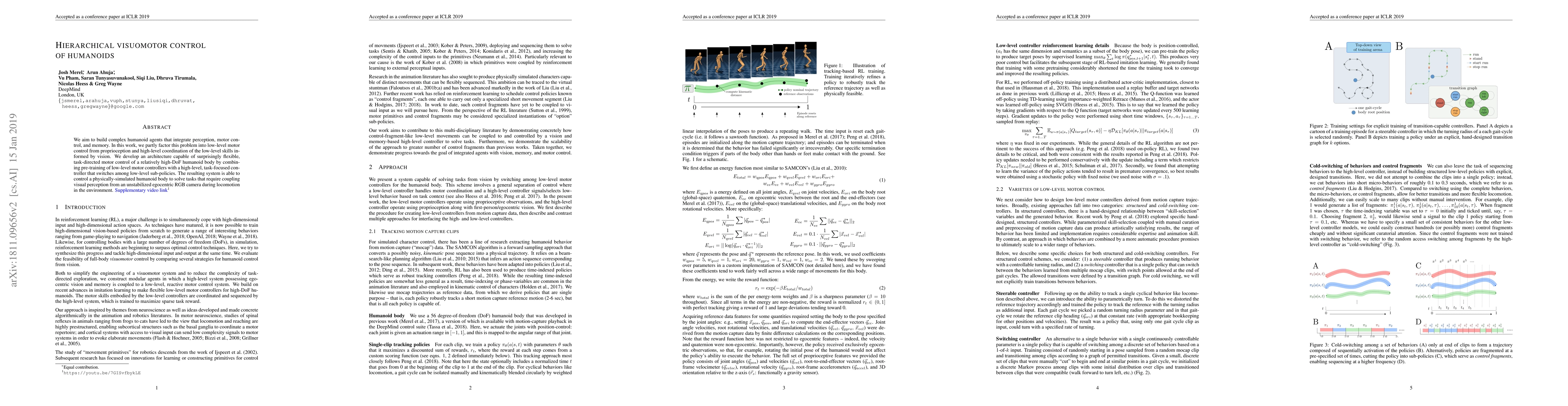 Researchers developed a humanoid agent that integrates perception, motor control, and memory through hierarchical visuomotor control, achieving surprisingly flexible task-directed motor control in a simulated environment.