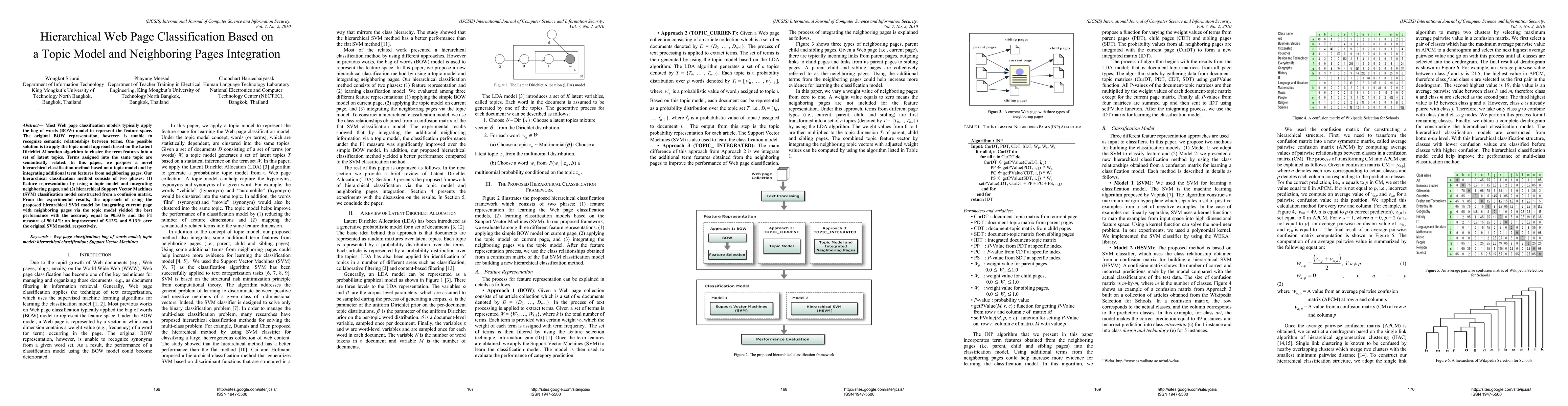 A new method for classifying web pages using a topic model and neighboring page integration improves accuracy to 90.33% with an F1 measure of 90.14%, outperforming original models.
