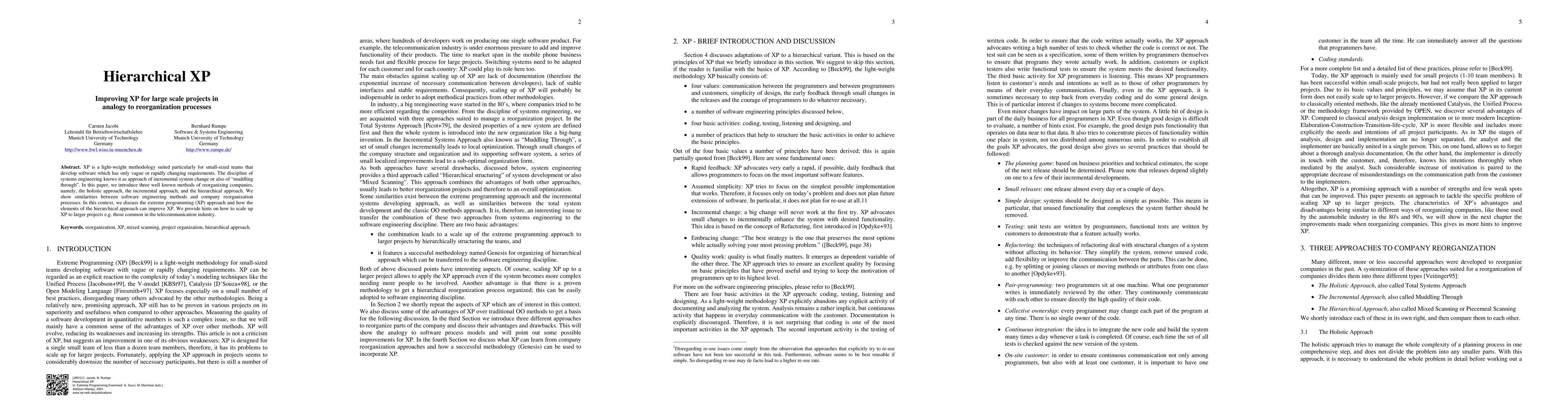 XP is a light-weight methodology suited particularly for small-sized teams that develop software which has only vague or rapidly changing requirements. The discipline of systems engineering knows it as approach of incremental system change or also of "muddling through". In this paper, we introduce three well known methods of reorganizing companies, namely, the holistic approach, the incremental approach, and the hierarchical approach. We show similarities between software engineering methods and company reorganizationprocesses. In this context, we discuss the extreme programming (XP) approach and how the elements of the hierarchical approach can improve XP. We provide hints on how to scale up XP to larger projects e.g. those common in the telecommunication industry.