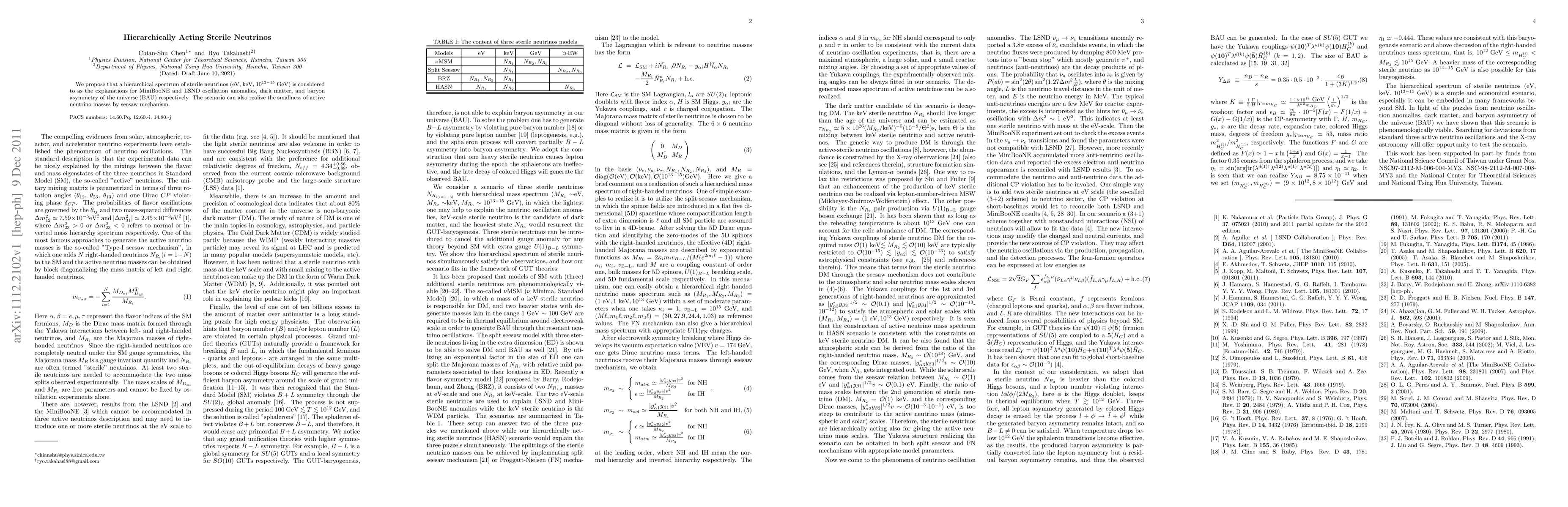 We propose that a hierarchical spectrum of sterile neutrinos (eV, keV, $10^{13-15}$ GeV) is considered to as the explanations for MiniBooNE and LSND oscillation anomalies, dark matter, and baryon asymmetry of the universe (BAU) respectively. The scenario can also realize the smallness of active neutrino masses by seesaw mechanism.