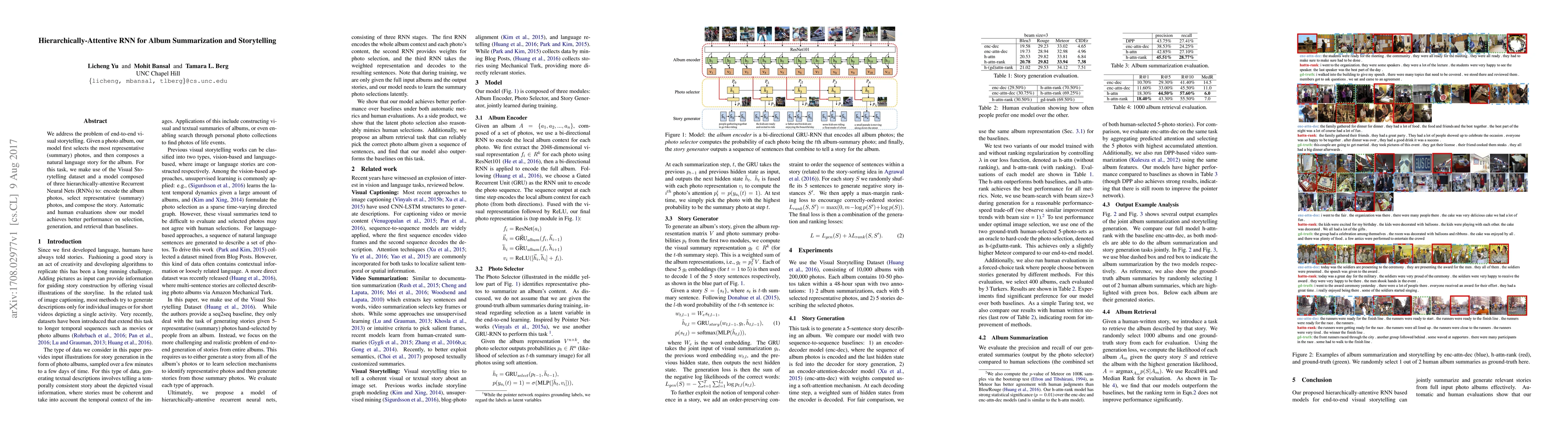 A new AI model uses hierarchical attention to select representative photos from an album and compose a natural language story around them, achieving better performance in selection, generation, and retrieval than existing baselines.