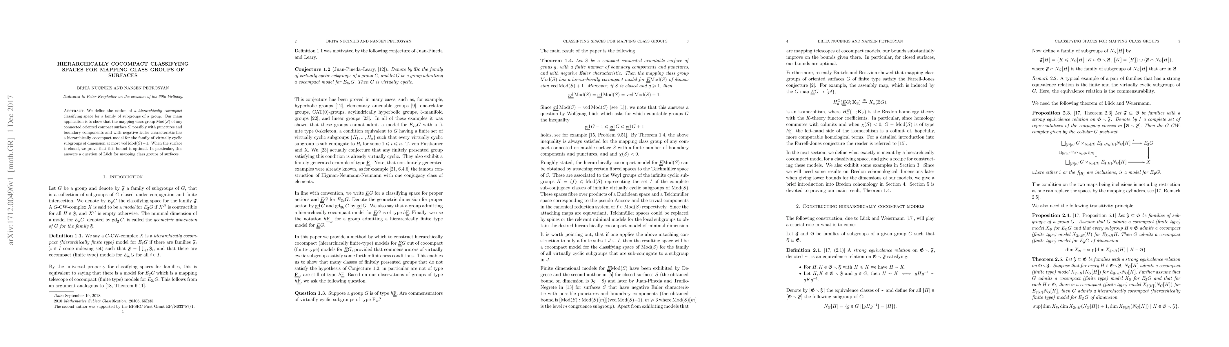 Summary: This paper introduces the concept of hierarchically cocompact classifying spaces for groups, demonstrating that mapping class groups of surfaces with negative Euler characteristic have such models for virtually cyclic subgroups. The authors prove optimality for closed surfaces, resolving a question posed by Lück.