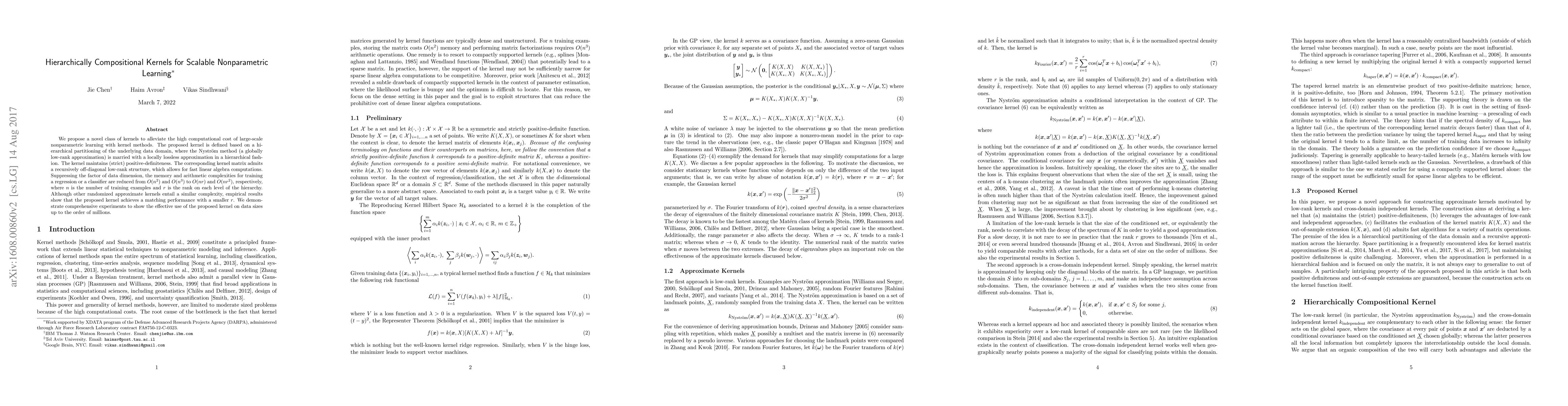 This paper introduces a novel hierarchically compositional kernel to reduce computational costs in large-scale nonparametric learning. The proposed kernel combines the Nyström method with a locally lossless approximation, achieving reduced memory and arithmetic complexities, and demonstrating effective performance on large datasets.