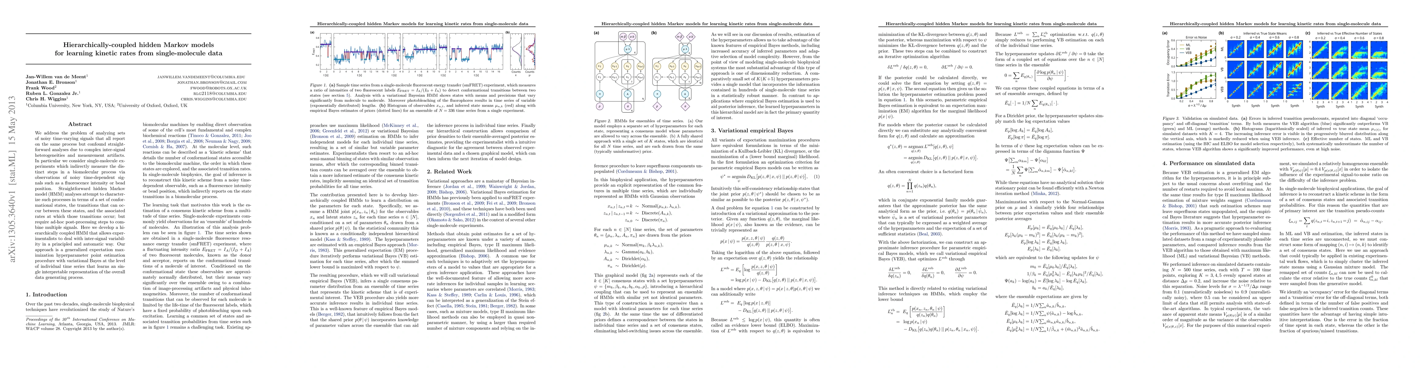 This paper proposes a hierarchically-coupled hidden Markov model to analyze noisy, time-varying signals from single-molecule experiments, enabling a unified approach to handle inter-signal variability without ad-hoc post-processing. The method uses a generalized expectation maximization and variational Bayes to derive a single interpretable model of the underlying biomolecular process.