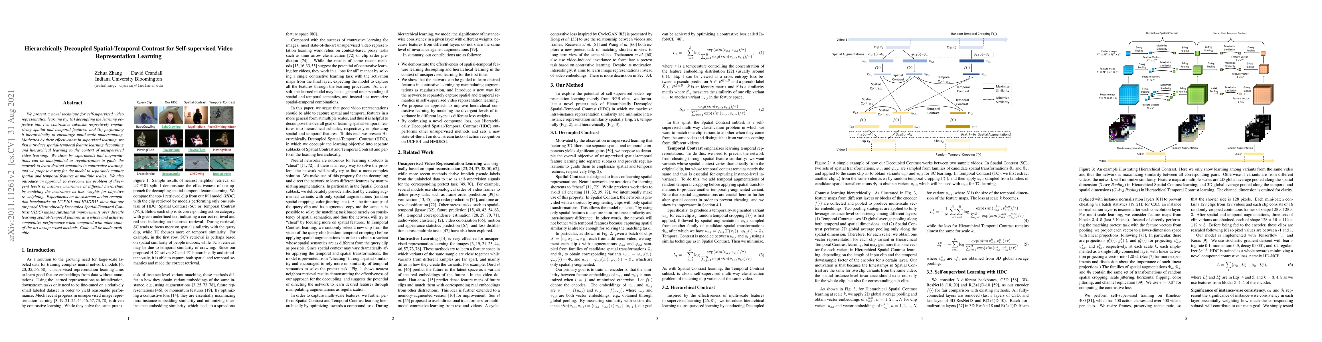 This paper introduces a self-supervised learning technique that hierarchically decouples spatial and temporal features for video representation learning, achieving better performance on action recognition tasks compared to other methods. The approach leverages contrastive learning and hierarchical learning to capture multi-scale features and addresses instance invariance issues through objective re-weighting.