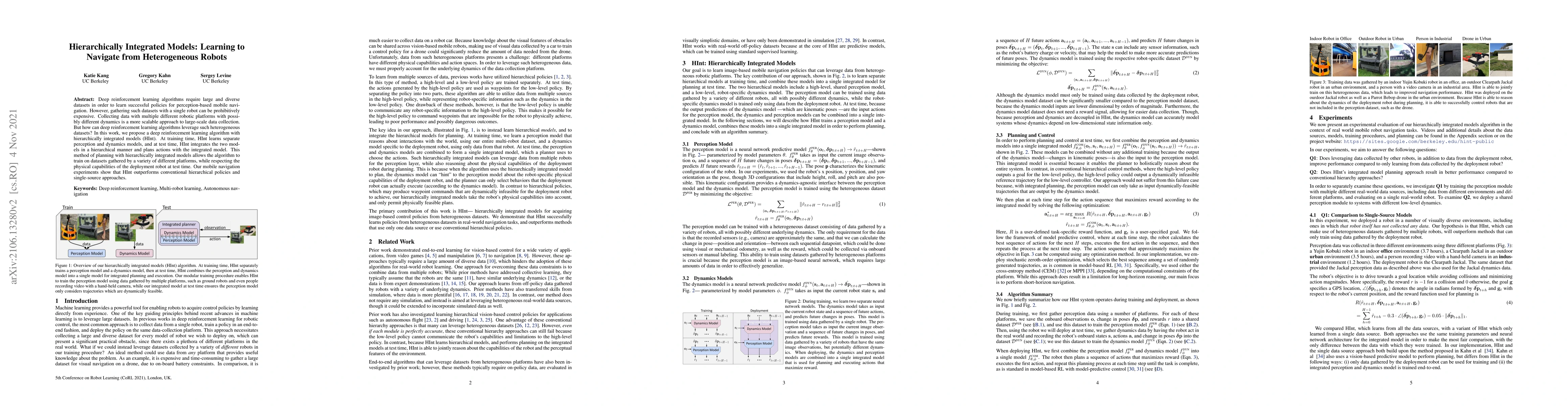 Deep reinforcement learning algorithms require large and diverse datasets in order to learn successful policies for perception-based mobile navigation. However, gathering such datasets with a single robot can be prohibitively expensive. Collecting data with multiple different robotic platforms with possibly different dynamics is a more scalable approach to large-scale data collection. But how can deep reinforcement learning algorithms leverage such heterogeneous datasets? In this work, we propose a deep reinforcement learning algorithm with hierarchically integrated models (HInt). At training time, HInt learns separate perception and dynamics models, and at test time, HInt integrates the two models in a hierarchical manner and plans actions with the integrated model. This method of planning with hierarchically integrated models allows the algorithm to train on datasets gathered by a variety of different platforms, while respecting the physical capabilities of the deployment robot at test time. Our mobile navigation experiments show that HInt outperforms conventional hierarchical policies and single-source approaches.