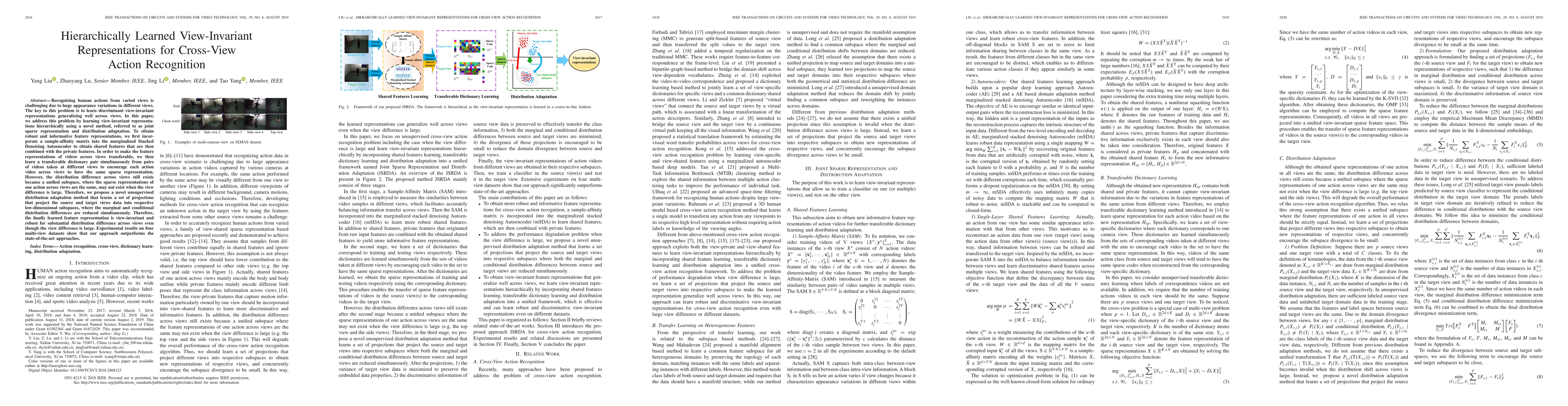 This paper proposes a method called Joint Sparse Representation and Distribution Adaptation (JSRDA) to learn hierarchically view-invariant representations for cross-view action recognition. It combines shared and private features from a marginalized stacked denoising Autoencoder and employs an unsupervised distribution adaptation technique to achieve robust and transferable features across different views.