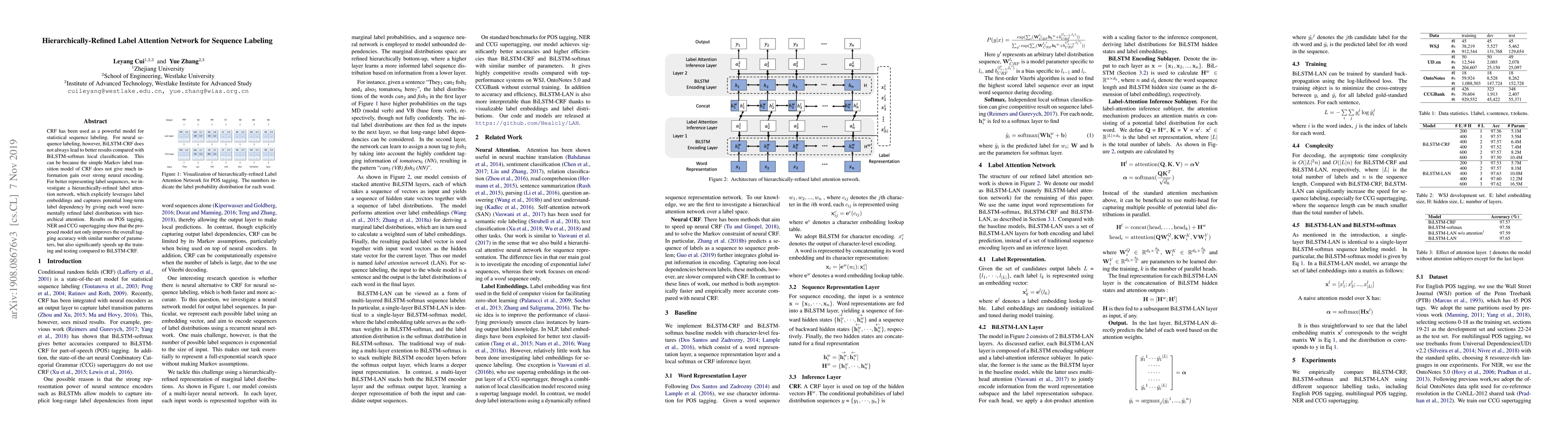 The paper proposes a hierarchically-refined label attention network to enhance neural sequence labeling, showing improved tagging accuracy and faster training/testing over BiLSTM-CRF. This model leverages label embeddings and hierarchical attention to capture long-term label dependencies.