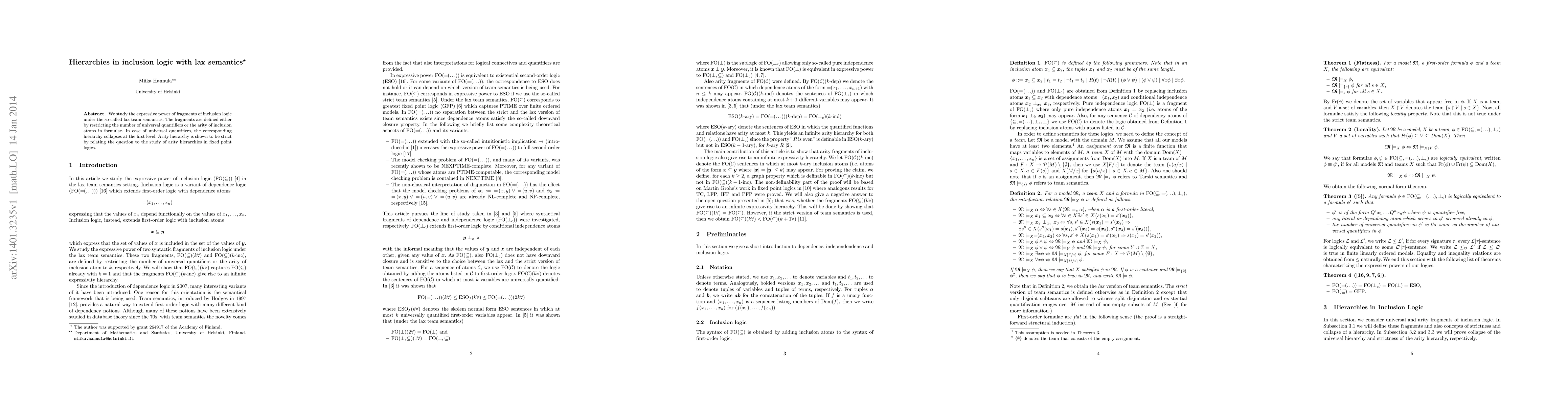 This paper investigates the expressive power of inclusion logic fragments under lax team semantics, focusing on hierarchies formed by limiting universal quantifiers or inclusion atom arities. The universal quantifier restriction leads to a hierarchy collapse at the first level, while the arity restriction maintains a strict hierarchy, analogous to fixed point logics.
