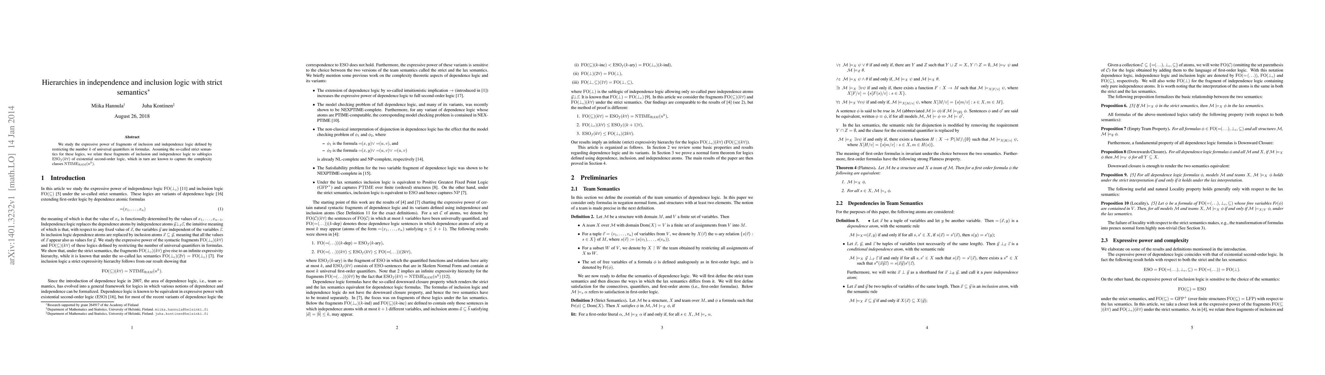 This paper investigates the expressive power of fragments of inclusion and independence logic by limiting the number of universal quantifiers, and under strict semantics, it connects these fragments to sublogics of existential second-order logic, which correspond to specific time complexity classes.
