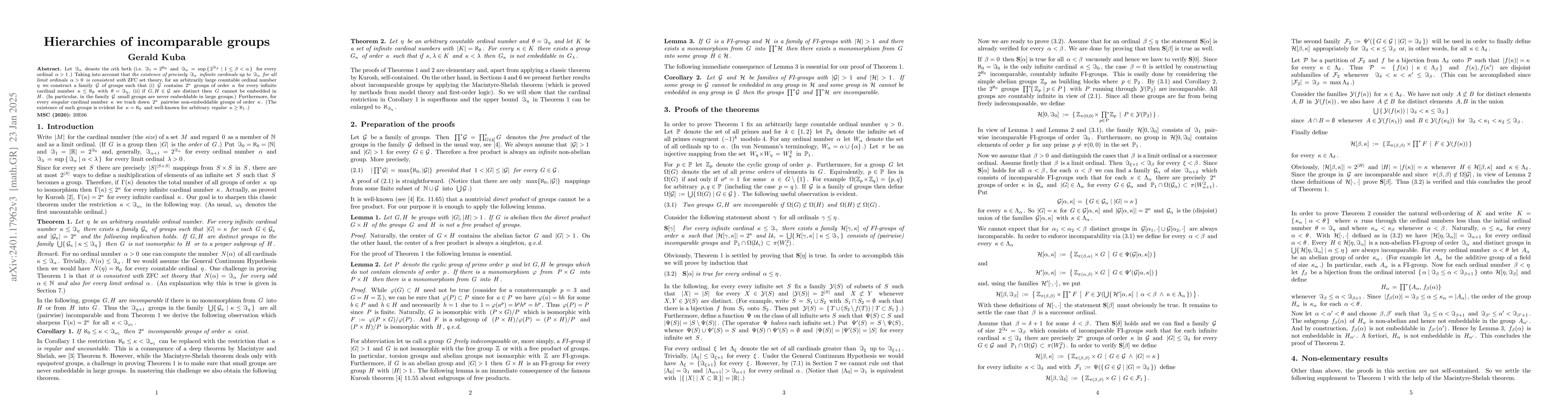 This paper constructs families of groups for each countable ordinal $\alpha$, where no group can be embedded in another, and each family contains $2^\kappa$ groups of order $\kappa$ for each infinite cardinal $\kappa$ up to $\beth_\alpha$. This demonstrates the existence of hierarchies of incomparable groups.