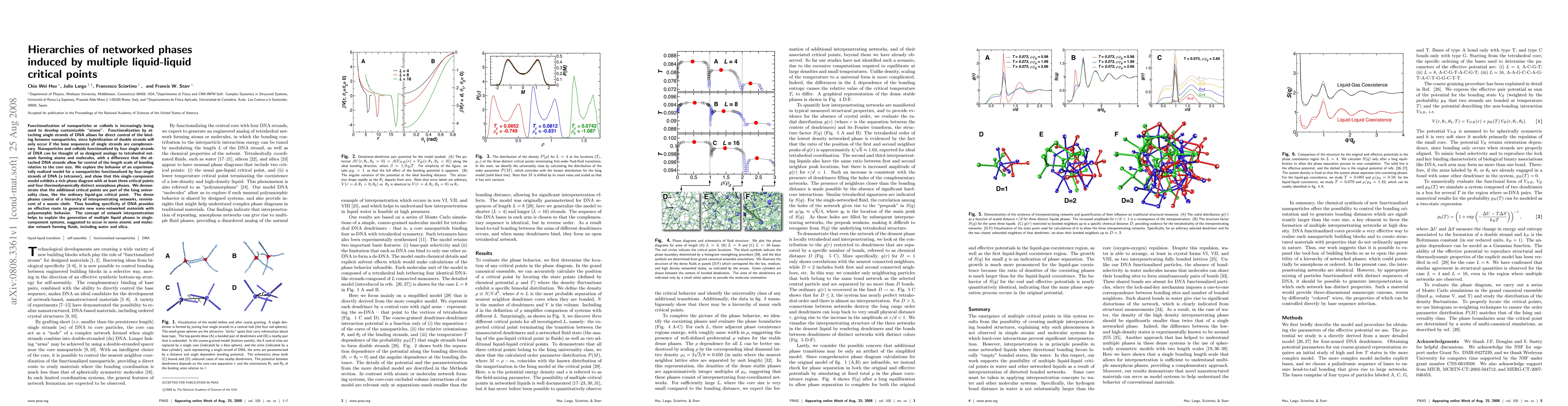 Functionalization of nanoparticles or colloids is increasingly being used to develop customizable "atoms". Functionalization by attaching single strands of DNA allows for direct control of the binding between nanoparticles, since hybridization of double strands will only occur if the base sequences of single strands are complementary. Nanoparticles and colloids functionalized by four single strands of DNA can be thought of as designed analogs to tetrahedral network forming atoms and molecules, with a difference that the attached DNA strands allow for control of the length scale of bonding relative to the core size. We explore the behavior of an experimentally realized model for a nanoparticles functionalized by four single strands of DNA (a tetramer), and show that this single-component model exhibits a rich phase diagram with at least three critical points and four thermodynamically distinct amorphous phases. We demonstrate that the additional critical points are part of the Ising universality class, like the ordinary liquid-gas critical point. The dense phases consist of a hierarchy of interpenetrating networks, reminiscent of a woven cloth. Thus bonding specificity of DNA provides an effective route to generate new nano-networked materials with polyamorphic behavior. The concept of network interpenetration helps to explain the generation of multiple liquid phases in single-component systems, suggested to occur in some atomic and molecular network forming fluids, including water and silica.