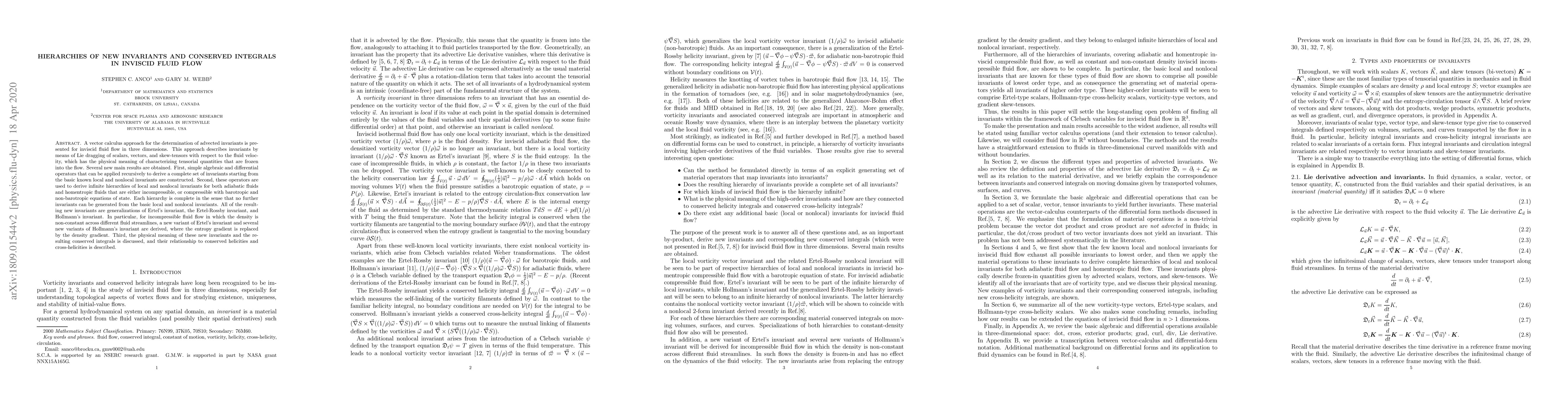 This paper presents a vector calculus approach to derive advected invariants in inviscid fluid flow using Lie dragging, constructing recursive operators to generate complete sets of invariants. It introduces infinite hierarchies of local and nonlocal invariants for various types of fluids, establishing their completeness and physical significance in relation to Ertel's, Ertel-Rossby, and Hollmann's invariants, and discusses their conserved integrals and connections to helicities.