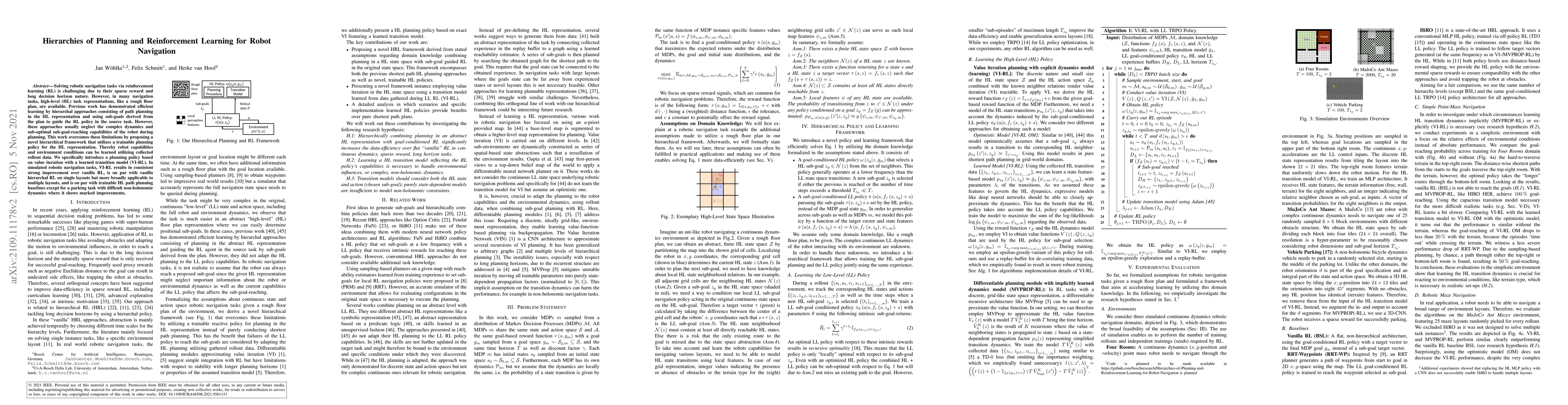 This paper proposes a hierarchical reinforcement learning framework for robot navigation that integrates a trainable planning policy based on value iteration with a learned transition model (VI-RL). The approach effectively addresses the challenges of sparse rewards and long decision horizons in RL by leveraging high-level task representations and improving upon previous hierarchical methods by incorporating learned robot capabilities and environment conditions.