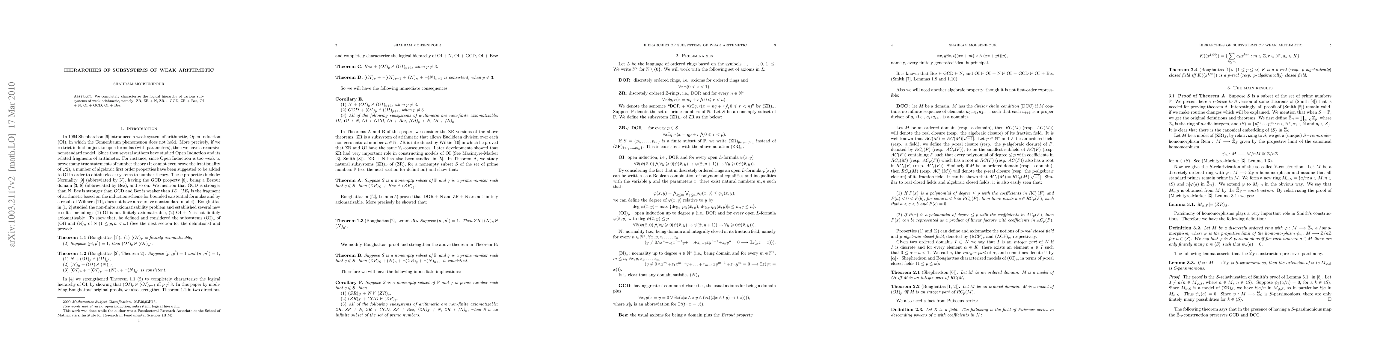 We completely characterize the logical hierarchy of various subsystems of weak arithmetic, namely: ZR, ZR + N, ZR + GCD, ZR + Bez, OI + N, OI + GCD, OI + Bez.