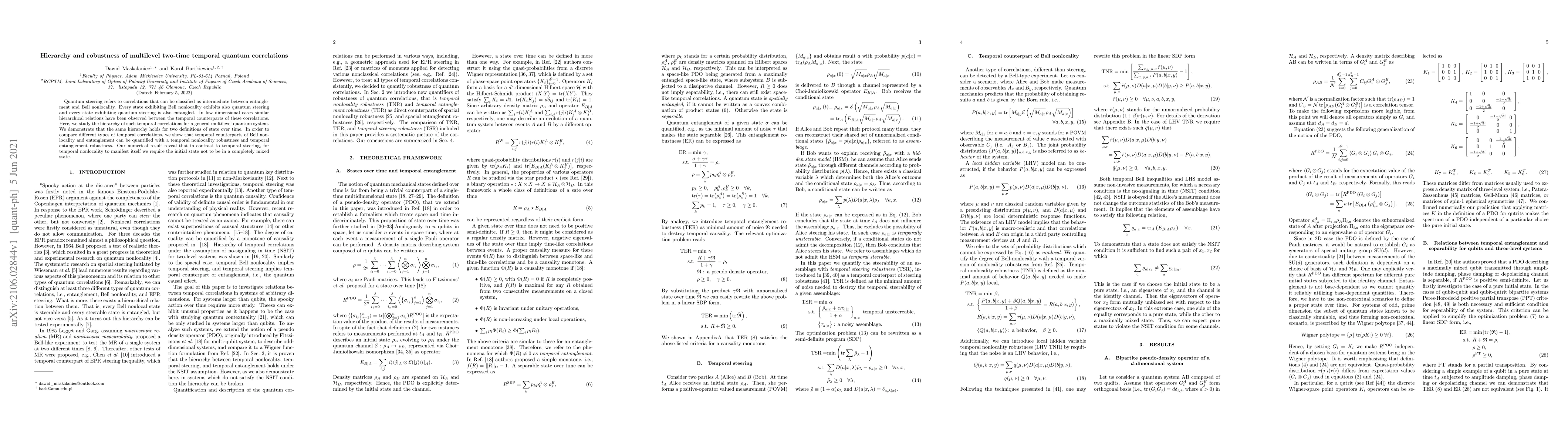 Quantum steering refers to correlations that can be classified as intermediate between entanglement and Bell nonlocality. Every state exhibiting Bell nonlocality exhibits also quantum steering and every state exhibiting quantum steering is also entangled. In low dimensional cases similar hierarchical relations have been observed between the temporal counterparts of these correlations. Here, we study the hierarchy of such temporal correlations for a general multilevel quantum system. We demonstrate that the same hierarchy holds for two definitions of state over time. In order to compare different types of temporal correlations, we show that temporal counterparts of Bell nonlocality and entanglement can be quantified with a temporal nonlocality robustness and temporal entanglement robustness. Our numerical result reveal that in contrast to temporal steering, for temporal nonlocality to manifest itself we require the initial state not to be in a completely mixed state.