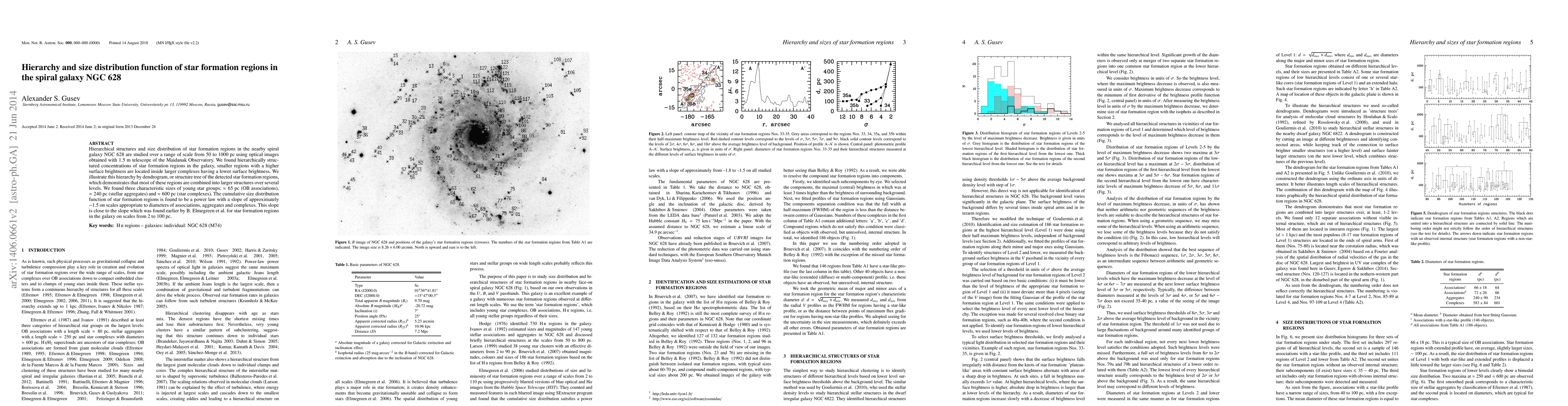 Hierarchical structures and size distribution of star formation regions in the nearby spiral galaxy NGC 628 are studied over a range of scale from 50 to 1000 pc using optical images obtained with 1.5 m telescope of the Maidanak Observatory. We found hierarchically structured concentrations of star formation regions in the galaxy, smaller regions with a higher surface brightness are located inside larger complexes having a lower surface brightness. We illustrate this hierarchy by dendrogram, or structure tree of the detected star formation regions, which demonstrates that most of these regions are combined into larger structures over several levels. We found three characteristic sizes of young star groups: 65 pc (OB associations), 240 pc (stellar aggregates) and 600 pc (star complexes). The cumulative size distribution function of star formation regions is found to be a power law with a slope of approximately -1.5 on scales appropriate to diameters of associations, aggregates and complexes. This slope is close to the slope which was found earlier by B. Elmegreen et al. for star formation regions in the galaxy on scales from 2 to 100 pc.