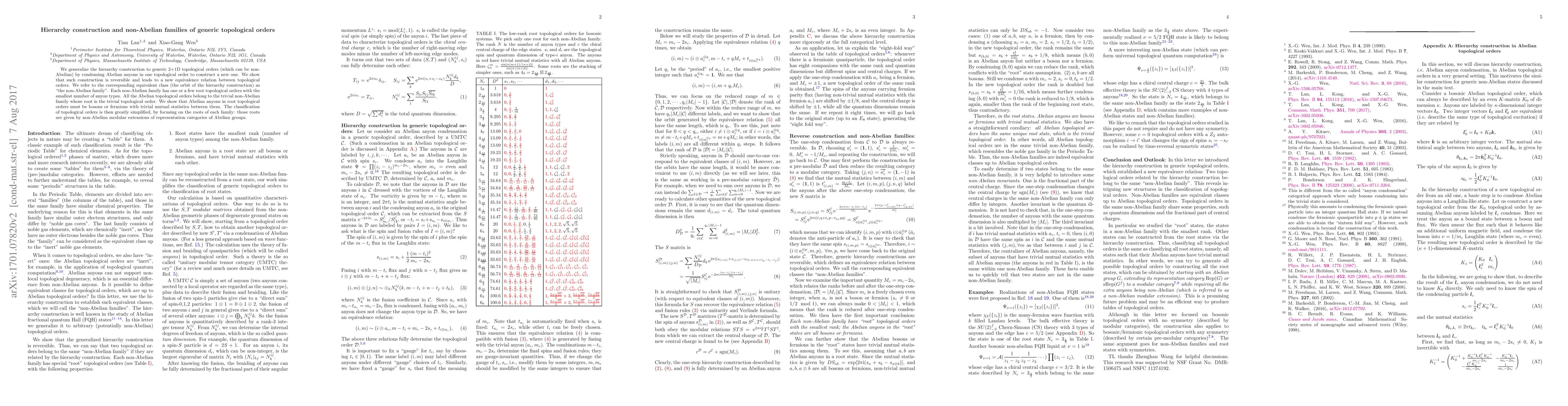 We generalize the hierarchy construction to generic 2+1D topological orders (which can be non-Abelian) by condensing Abelian anyons in one topological order to construct a new one. We show that such construction is reversible and leads to a new equivalence relation between topological orders. We refer to the corresponding equivalent class (the orbit of the hierarchy construction) as "the non-Abelian family". Each non-Abelian family has one or a few root topological orders with the smallest number of anyon types. All the Abelian topological orders belong to the trivial non-Abelian family whose root is the trivial topological order. We show that Abelian anyons in root topological orders must be bosons or fermions with trivial mutual statistics between them. The classification of topological orders is then greatly simplified, by focusing on the roots of each family: those roots are given by non-Abelian modular extensions of representation categories of Abelian groups.