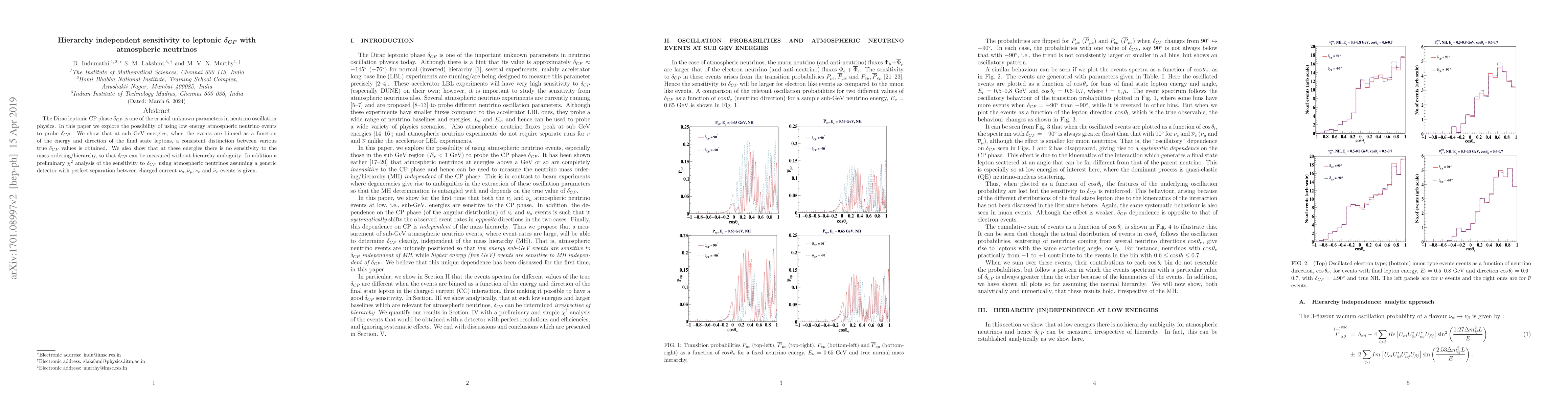 The Dirac leptonic CP phase {\delta}_CP is one of the crucial unknown parameters in neutrino oscillation physics. In this paper we explore the possibility of using low energy atmospheric neutrino events to probe {\delta}_CP . We show that at sub GeV energies, when the events are binned as a function of the energy and direction of the final state leptons, a consistent distinction between various true {\delta}_CP values is obtained. We also show that at these energies there is no sensitivity to the mass ordering/hierarchy, so that {\delta}_CP can be measured without hierarchy ambiguity. In addition a preliminary \c{hi}^2 analysis of the sensitivity to {\delta}_CP using atmospheric neutrinos assuming a generic detector with perfect separation between charged current {\nu}_{\mu} , \bar{{\nu}}_{\mu} , {\nu}_e and \bar{{\nu}}_e events is given.