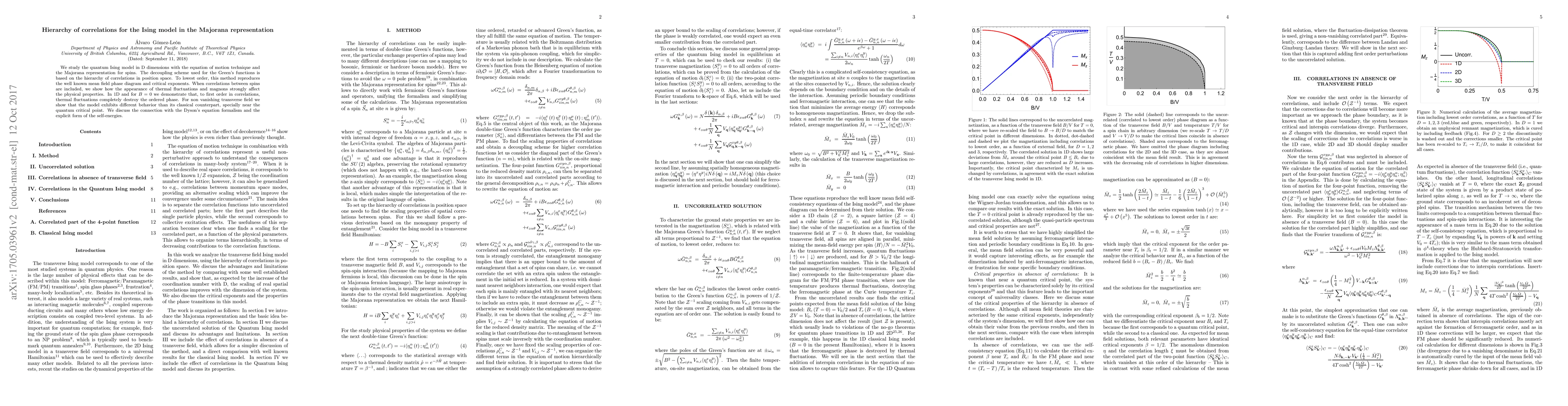 We study the quantum Ising model in D dimensions with the equation of motion technique, in combination with the Majorana representation for spins. The decoupling scheme used for the Green's functions is based on the hierarchy of correlations in position space. To lowest order this method reproduces the well known mean field phase diagram and critical exponents. When correlations between spins are included, we show how the appearance of thermal fluctuations and magnons strongly affect the physical properties. We demonstrate that in 1D and for B=0, thermal fluctuations completely destroy the ordered phase, and that near the quantum critical point, the quantum model displays different behavior than its classical counterpart. We discuss the connection with the Dyson's equation formalism and the explicit form of the self-energies.