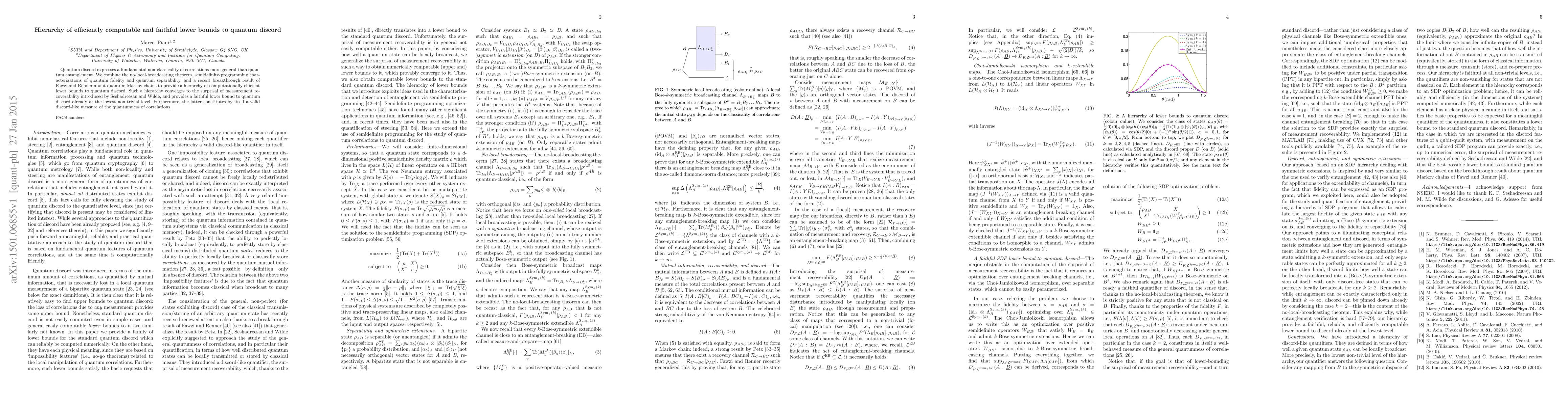Quantum discord expresses a fundamental non-classicality of correlations more general than quantum entanglement. We combine the no-local-broadcasting theorem, semidefinite-programming characterizations of quantum fidelity and quantum separability, and a recent breakthrough result of Fawzi and Renner about quantum Markov chains to provide a hierarchy of computationally efficient lower bounds to quantum discord. Such a hierarchy converges to the surprisal of measurement recoverability introduced by Seshadreesan and Wilde, and provides a faithful lower bound to quantum discord already at the lowest non-trivial level. Furthermore, the latter constitutes by itself a valid discord-like measure of the quantumness of correlations.