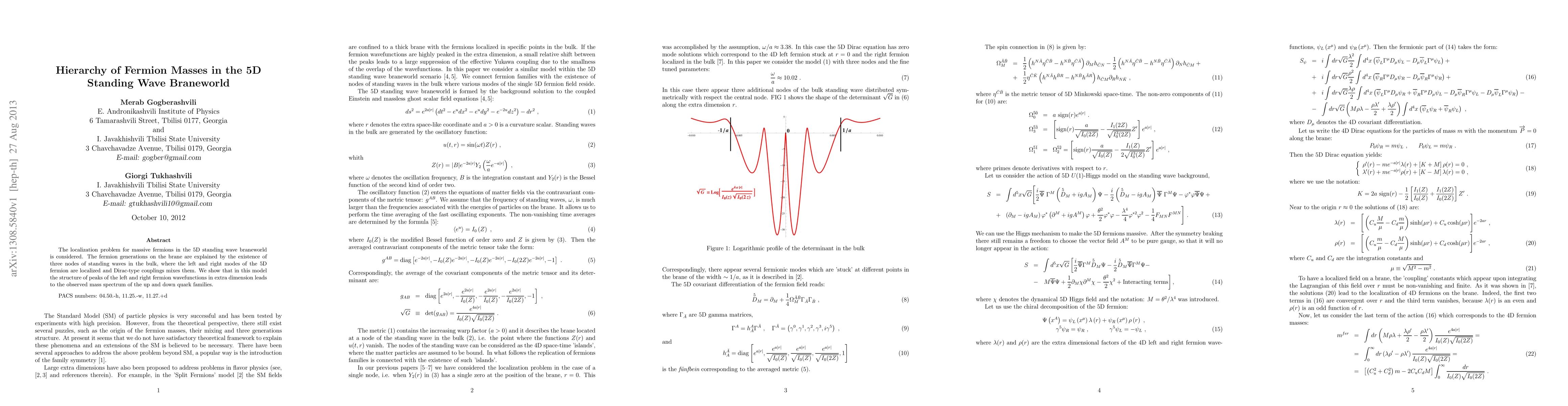 A 5D standing wave braneworld model explains the hierarchy of fermion masses by mixing left and right modes at specific nodes, matching the observed mass spectrum of up and down quark families.