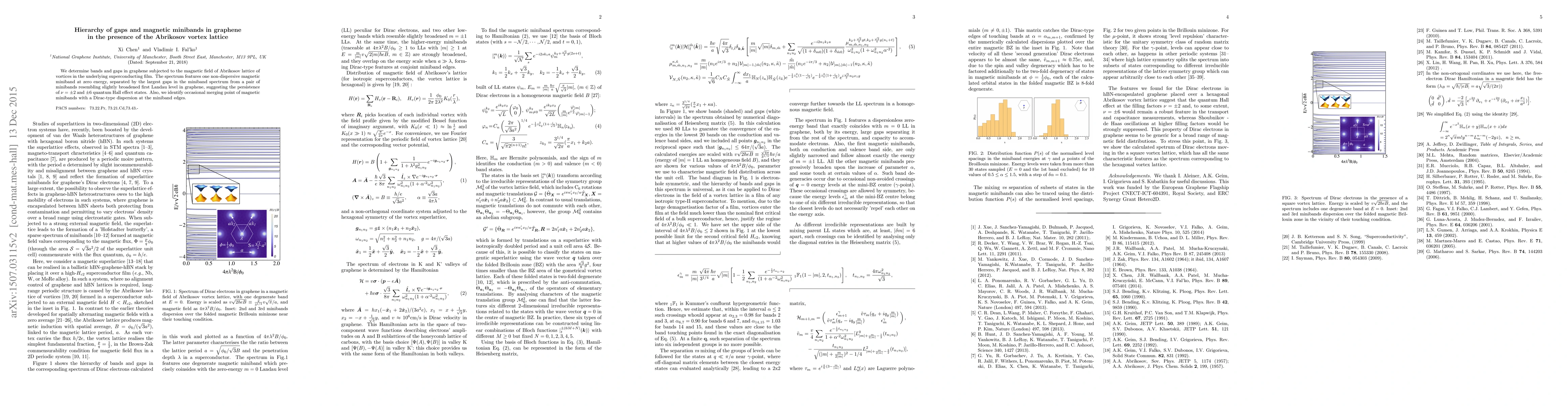This study reveals the formation of magnetic minibands in graphene within hexagonal boron nitride under a magnetic field from an Abrikosov vortex lattice, showing a non-dispersive miniband at zero energy and two broadened minibands akin to first Landau levels, indicative of persistent $\nu = \pm 2$ quantum Hall effect states, with occasional merging points displaying Dirac-type dispersion.