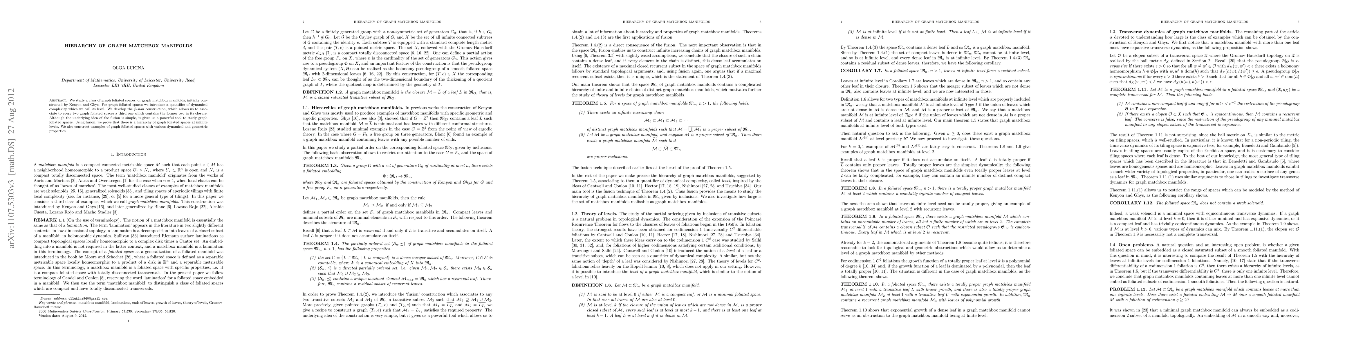 We study a class of graph foliated spaces, or graph matchbox manifolds, initially constructed by Kenyon and Ghys. For graph foliated spaces we introduce a quantifier of dynamical complexity which we call its level. We develop the fusion construction, which allows us to associate to every two graph foliated spaces a third one which contains the former two in its closure. Although the underlying idea of the fusion is simple, it gives us a powerful tool to study graph foliated spaces. Using fusion, we prove that there is a hierarchy of graph foliated spaces at infinite levels. We also construct examples of graph foliated spaces with various dynamical and geometric properties.