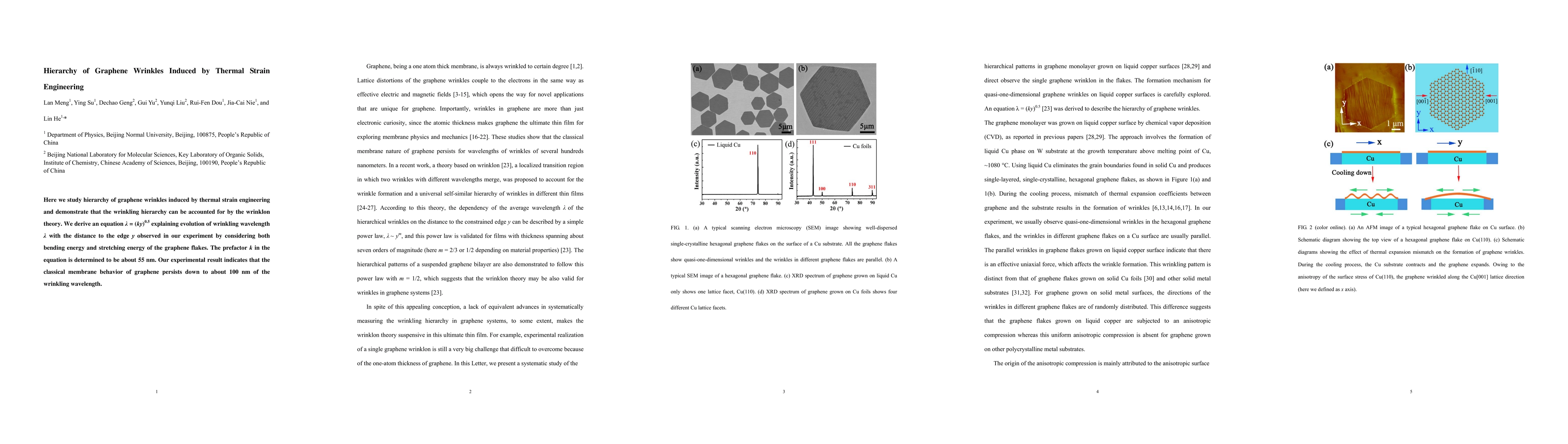 This paper investigates the hierarchy of graphene wrinkles formed through thermal strain engineering, demonstrating that the wrinkling pattern can be explained by the wrinklon theory. The study derives an equation relating the wrinkling wavelength to the distance from the graphene edge, revealing a persistence of classical membrane behavior down to 100 nm.