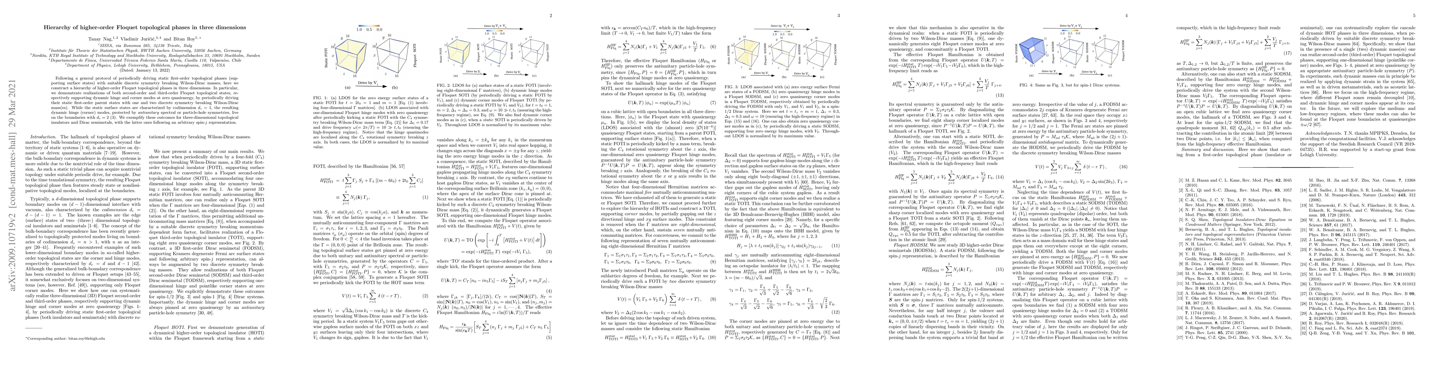 Following a general protocol of periodically driving static first-order topological phases (supporting surface states) with suitable discrete symmetry breaking Wilson-Dirac masses, here we construct a hierarchy of higher-order Floquet topological phases in three dimensions. In particular, we demonstrate realizations of both second-order and third-order Floquet topological states, respectively supporting dynamic hinge and corner modes at zero quasienergy, by periodically driving their static first-order parent states with one and two discrete symmetry breaking Wilson-Dirac mass(es). While the static surface states are characterized by codimension $d_c=1$, the resulting dynamic hinge (corner) modes, protected by \emph{antiunitary} spectral or particle-hole symmetries, live on the boundaries with $d_c=2$ $(3)$. We exemplify these outcomes for three-dimensional topological insulators and Dirac semimetals, with the latter ones following an arbitrary spin-$j$ representation.