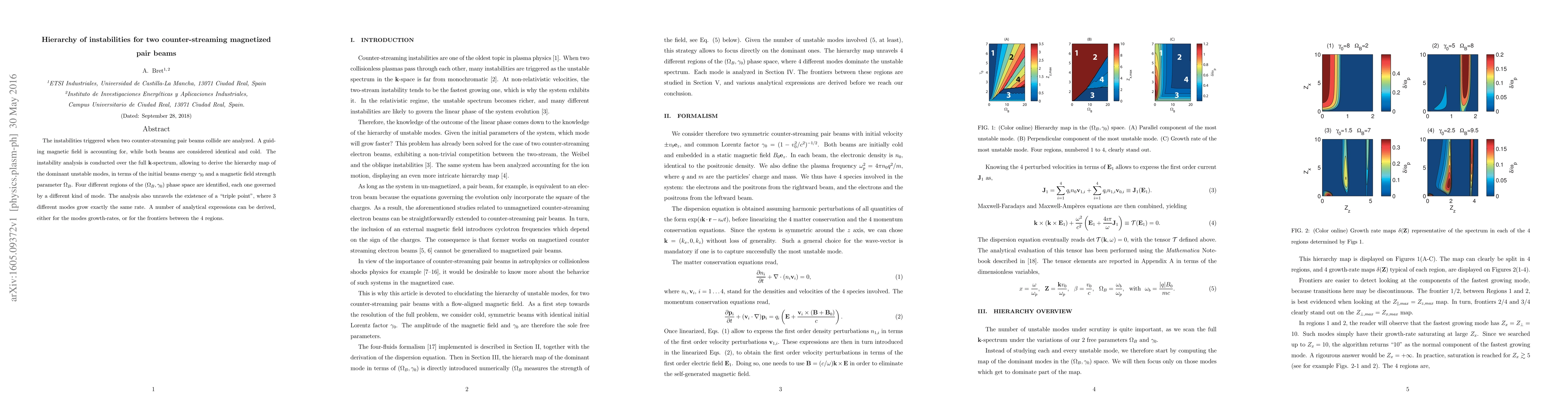 This paper analyzes instabilities in two counter-streaming magnetized pair beams, identifying a hierarchy of dominant unstable modes based on beam energy and magnetic field strength. Four distinct regions in the $(\Omega_B,\gamma_0)$ phase space are characterized by different modes, with a "triple point" where three modes grow at the same rate.