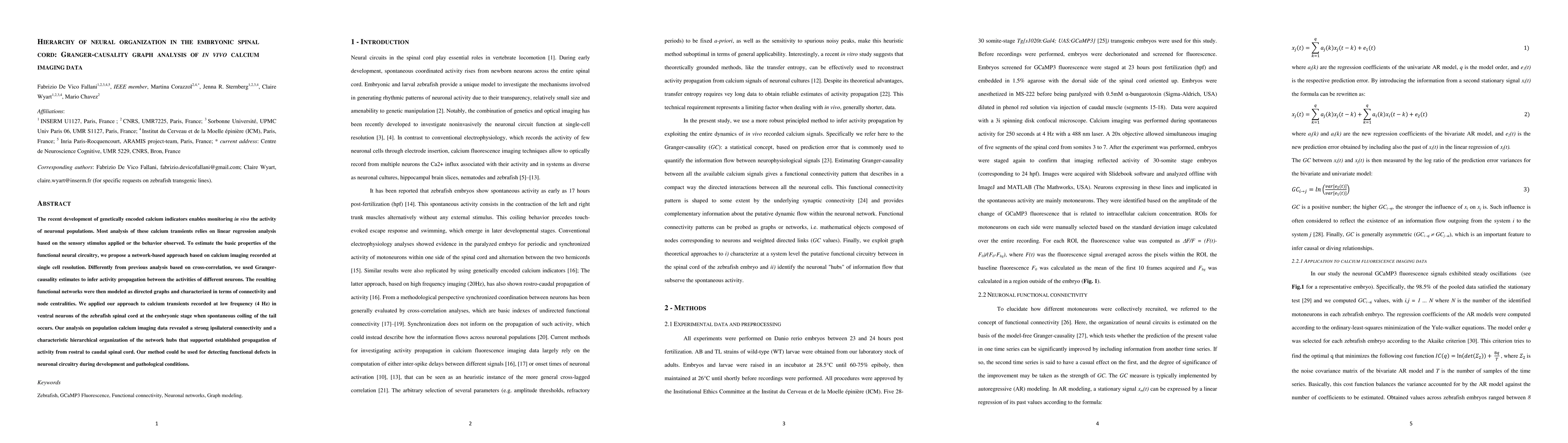 This paper proposes a network-based approach using Granger-causality analysis of in vivo calcium imaging data to infer functional neural circuitry in the embryonic zebrafish spinal cord. The study reveals a hierarchical organization of neural hubs with strong ipsilateral connectivity and activity propagation from rostral to caudal regions.