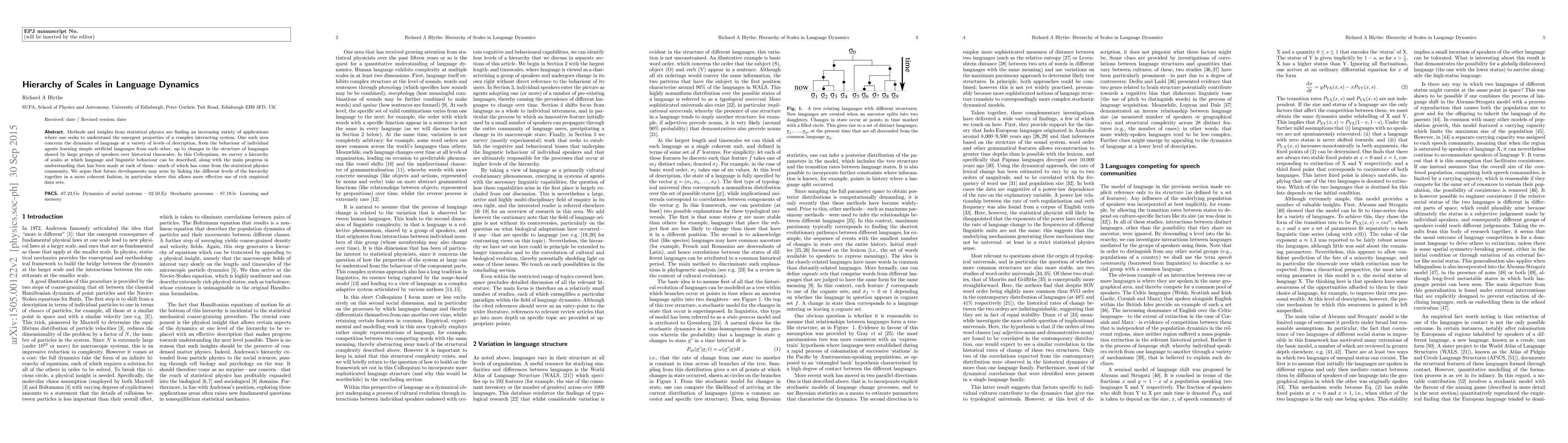 The paper discusses a hierarchy of scales in language dynamics, drawing from statistical physics. It explores language behavior from individual learning to historical language changes, highlighting progress made at each scale, largely from statistical physics. Future developments are suggested by linking these scales coherently, especially to better utilize empirical data.