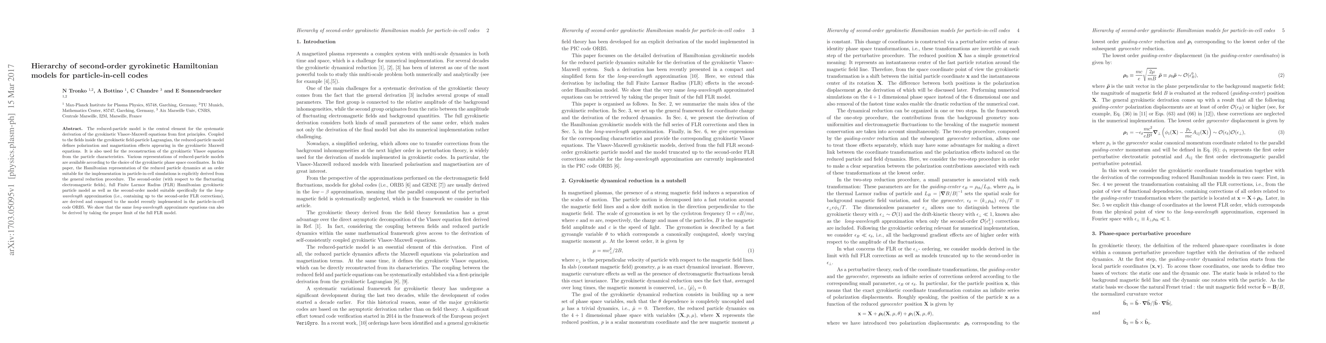 The reduced-particle model is the central element for the systematic derivation of the gyrokinetic Vlasov-Maxwell equations from first principles. Coupled to the fields inside the gyrokinetic field-particle Lagrangian, the reduced-particle model defines polarization and magnetization effects appearing in the gyrokinetic Maxwell equations. It is also used for the reconstruction of the gyrokinetic Vlasov equation from the particle characteristics. Various representations of reduced-particle models are available according to the choice of the gyrokinetic phase space coordinates. In this paper, the Hamiltonian representation of the reduced particle dynamics at an order suitable for the implementation in particle-in-cell simulations is explicitly derived from the general reduction procedure. The second-order (with respect to the fluctuating electromagnetic fields), full Finite Larmor Radius (FLR) Hamiltonian gyrokinetic particle model as well as the second-order model suitable specifically for the long-wavelength approximation (i.e., containing up to the second-order FLR corrections), are derived and compared to the model recently implemented in the particle-in-cell code ORB5. We show that the same long-wavelength approximate equations can also be derived by taking the proper limit of the full FLR model.