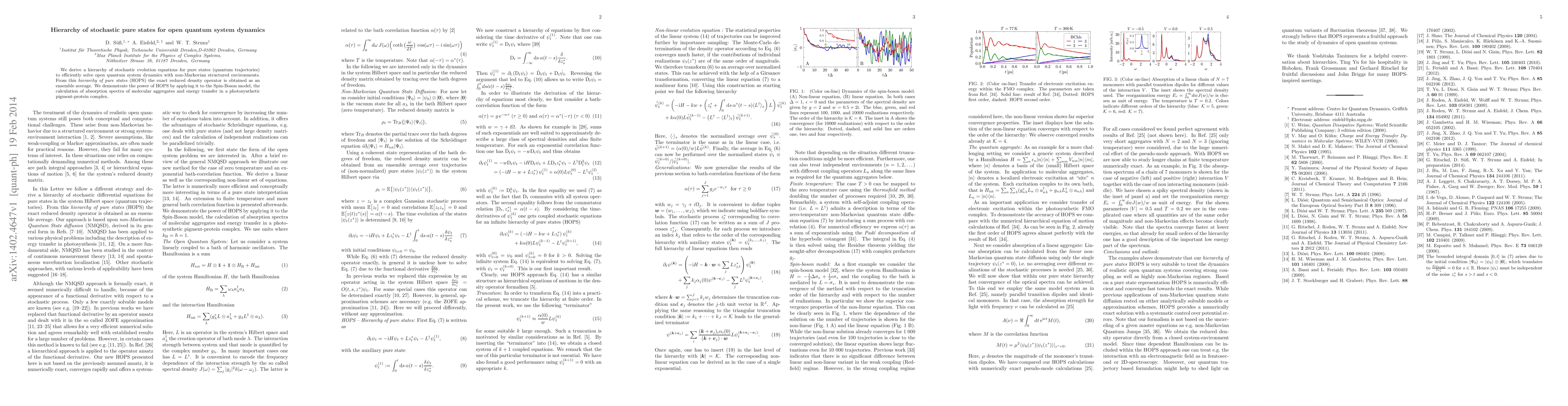 This paper develops a hierarchy of stochastic evolution equations for pure states to solve open quantum system dynamics in non-Markovian environments. The proposed Hierarchy of Pure States (HOPS) method provides an exact reduced density operator through ensemble averaging and demonstrates its effectiveness in modeling the Spin-Boson model, molecular aggregates, and energy transfer in photosynthetic complexes.