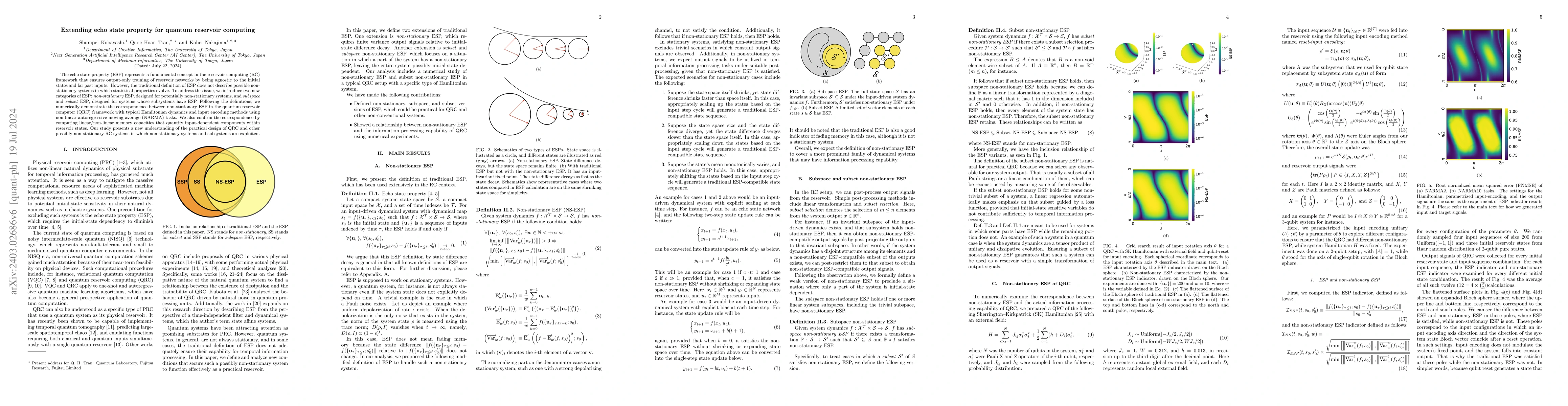 This paper introduces two new categories of echo state property (ESP) for quantum reservoir computing: non-stationary ESP for evolving systems and subspace/subset ESP for systems with ESP subsystems. It numerically demonstrates these concepts within quantum reservoir computers using Hamiltonian dynamics and confirms their effectiveness through memory capacity computations.