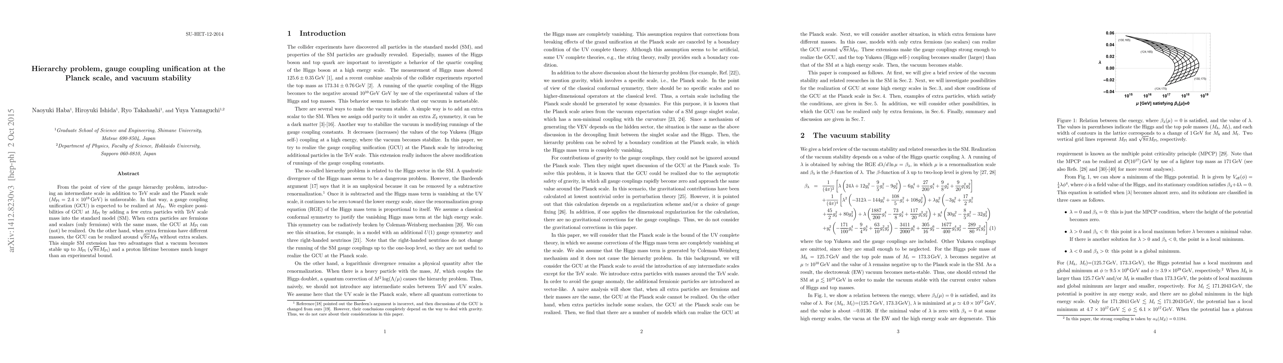This paper investigates the gauge coupling unification at the Planck scale and addresses the hierarchy problem by introducing extra particles into the Standard Model. It finds that gauge coupling unification can be achieved without extra scalars when extra fermions have different masses, leading to vacuum stability up to the Planck scale and a longer proton lifetime.