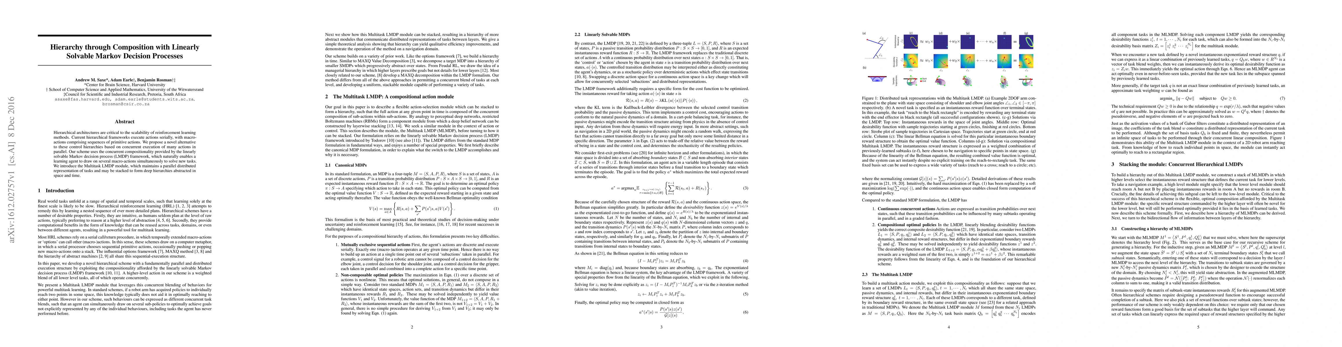 This paper proposes a novel hierarchical reinforcement learning framework using concurrent execution of macro-actions through the linearly solvable Markov decision process (LMDP) framework, enabling parallel compositionality and scalability. The Multitask LMDP module supports deep hierarchical structures by maintaining parallel distributed representations of tasks.