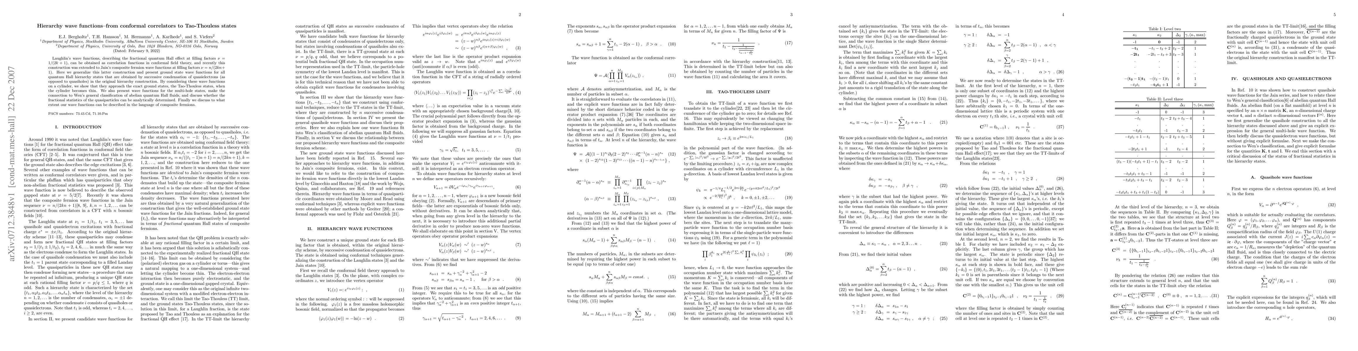This paper generalizes wave functions for quantum Hall hierarchy states by extending the conformal field theory approach, showing their convergence to exact Tao-Thouless states on thin cylinders. It also discusses multi-hole states and their relation to Wen's classification and the feasibility of analytically determining quasiparticle statistics.