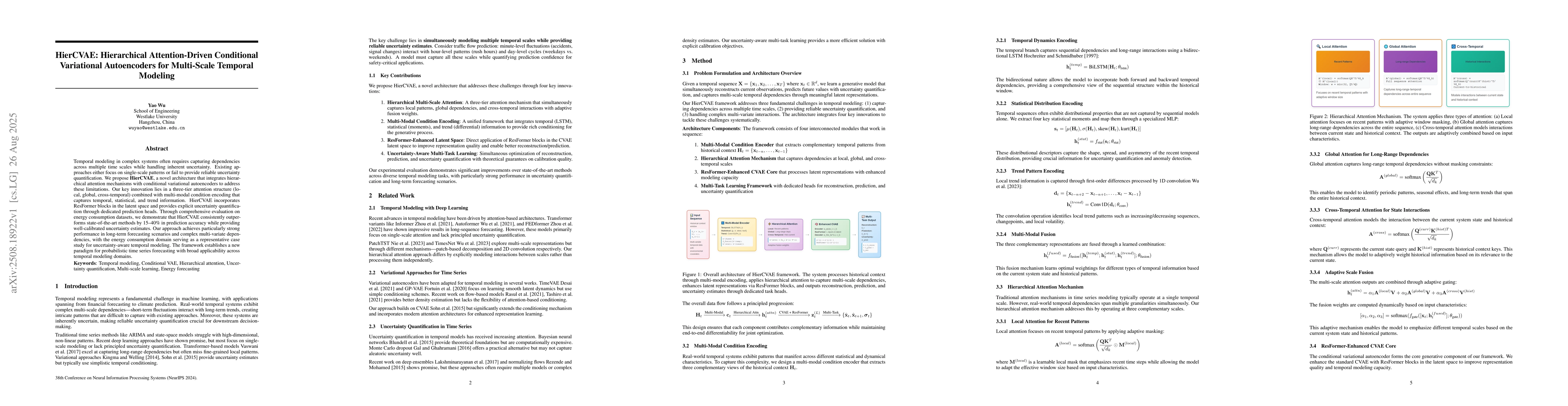 Temporal modeling in complex systems requires capturing dependencies across multiple time scales while managing inherent uncertainties. We propose HierCVAE, a novel architecture that integrates hierarchical attention mechanisms with conditional variational autoencoders to address these challenges. HierCVAE employs a three-tier attention structure (local, global, cross-temporal) combined with multi-modal condition encoding to capture temporal, statistical, and trend information. The approach incorporates ResFormer blocks in the latent space and provides explicit uncertainty quantification via prediction heads. Through evaluations on energy consumption datasets, HierCVAE demonstrates a 15-40% improvement in prediction accuracy and superior uncertainty calibration compared to state-of-the-art methods, excelling in long-term forecasting and complex multi-variate dependencies.