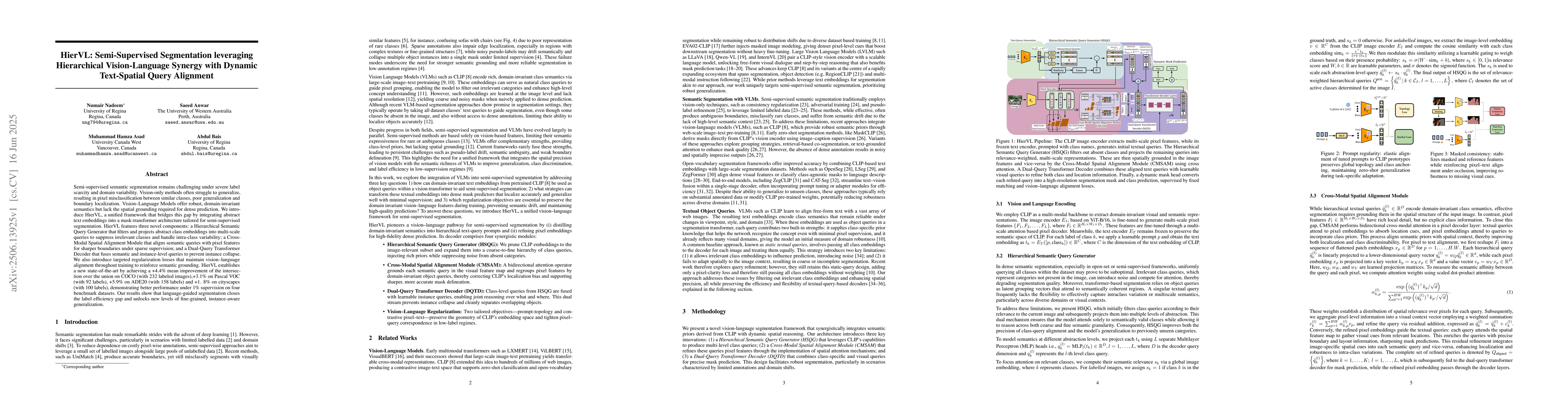 The research introduces HierVL, a framework that combines vision and language models for semi-supervised semantic segmentation. HierVL uses hierarchical queries, cross-modal alignment, and dual-query transformers to improve pixel classification, boundary localization, and instance awareness under limited labels. It outperforms existing methods on COCO, Pascal VOC, ADE20, and Cityscapes datasets, demonstrating superior performance with minimal supervision.