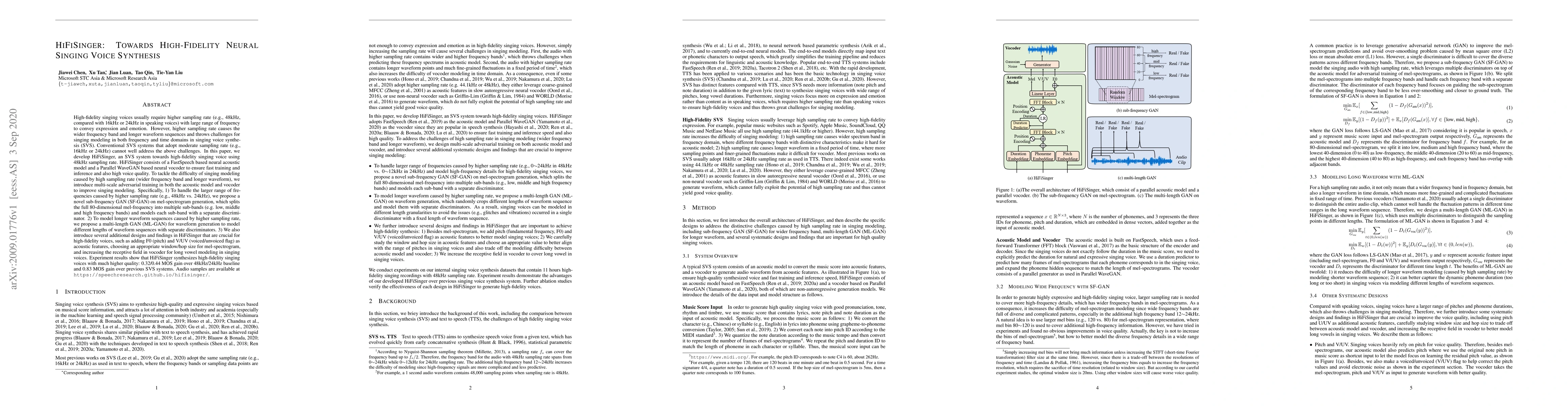 HiFiSinger is an advanced singing voice synthesis system that combines FastSpeech and Parallel WaveGAN to achieve high-fidelity singing voices at 48kHz sampling rate. It employs multi-scale adversarial training and novel sub-frequency and multi-length GANs to handle the challenges of wider frequency bands and longer waveform sequences, resulting in significant improvements in voice quality.
