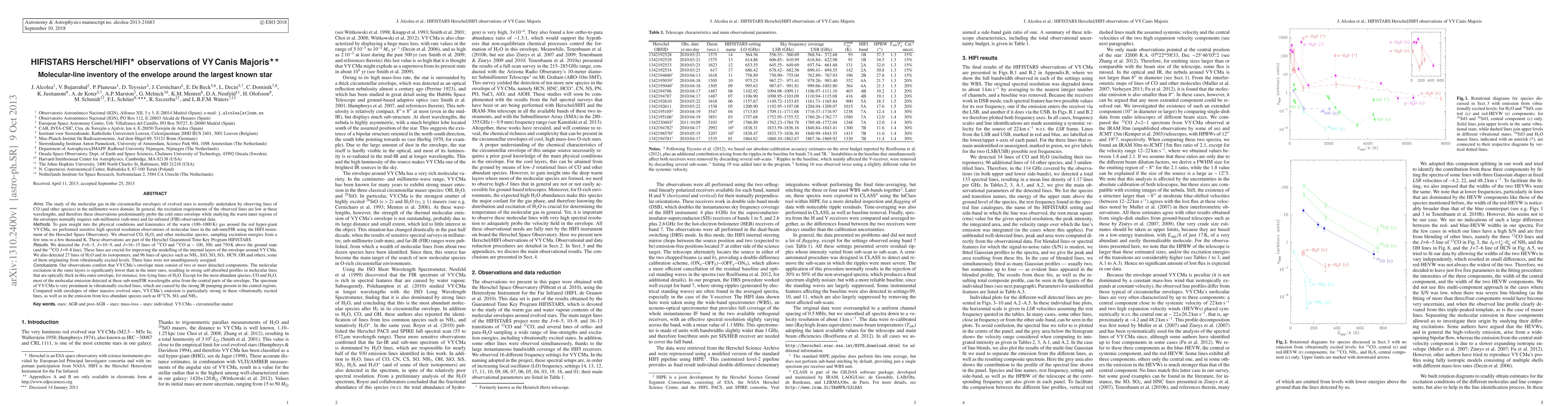 This study uses Herschel/HIFI observations to analyze the molecular composition and physical conditions of the warm gas around VY CMa, revealing multiple detached components in its envelope. Key findings include the detection of CO, H2O, and other molecular lines, indicating significant differences in excitation between the inner and outer layers, with strong IR pumping in the central regions.