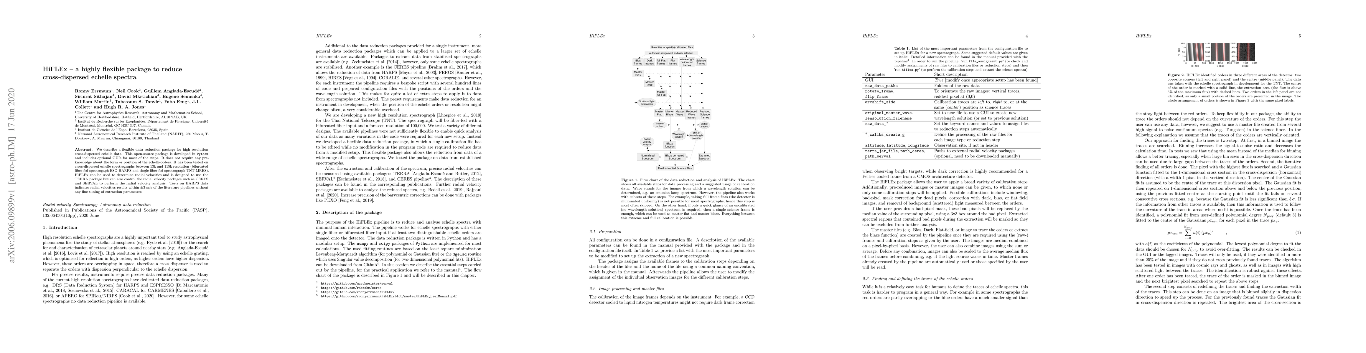 We describe a flexible data reduction package for high resolution cross-dispersed echelle data. This open-source package is developed in Python and includes optional GUIs for most of the steps. It does not require any pre-knowledge about the form or position of the echelle-orders. It has been tested on cross-dispersed echelle spectrographs between 13k and 115k resolution (bifurcated fiber-fed spectrogaph ESO-HARPS and single fiber-fed spectrograph TNT-MRES). HiFLEx can be used to determine radial velocities and is designed to use the TERRA package but can also control the radial velocity packages such as CERES and SERVAL to perform the radial velocity analysis. Tests on HARPS data indicates radial velocities results within 3m/s of the literature pipelines without any fine tuning of extraction parameters.