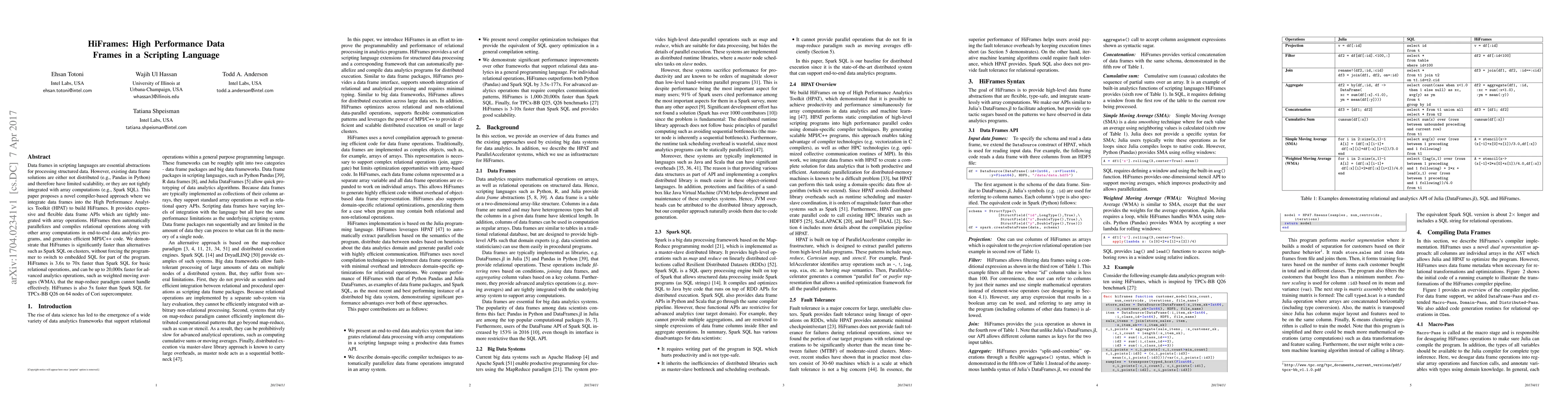 HiFrames integrates data frames into the High Performance Analytics Toolkit (HPAT) for scalable, parallel processing of structured data, achieving significant speedups over Spark SQL in various analytics tasks. It offers faster execution for both basic and advanced operations without requiring a shift to embedded SQL.